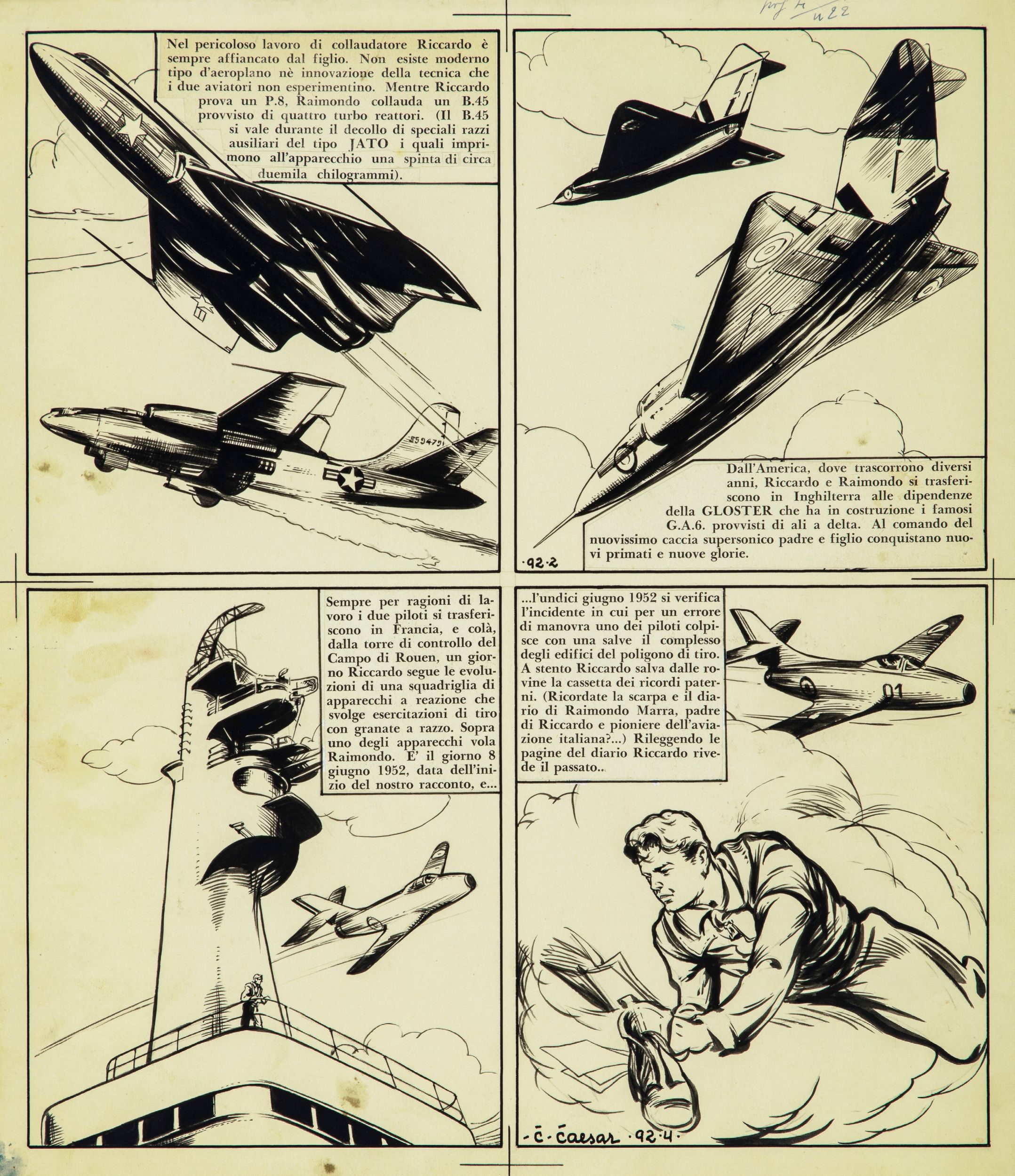 anni 40 Tavola originale realizzata da Caesar per una delle sue celebri avventure nei cieli edita sulle pagine de Il Vittorioso nei primi anni '40. Acquerellata al retro. Firmata.