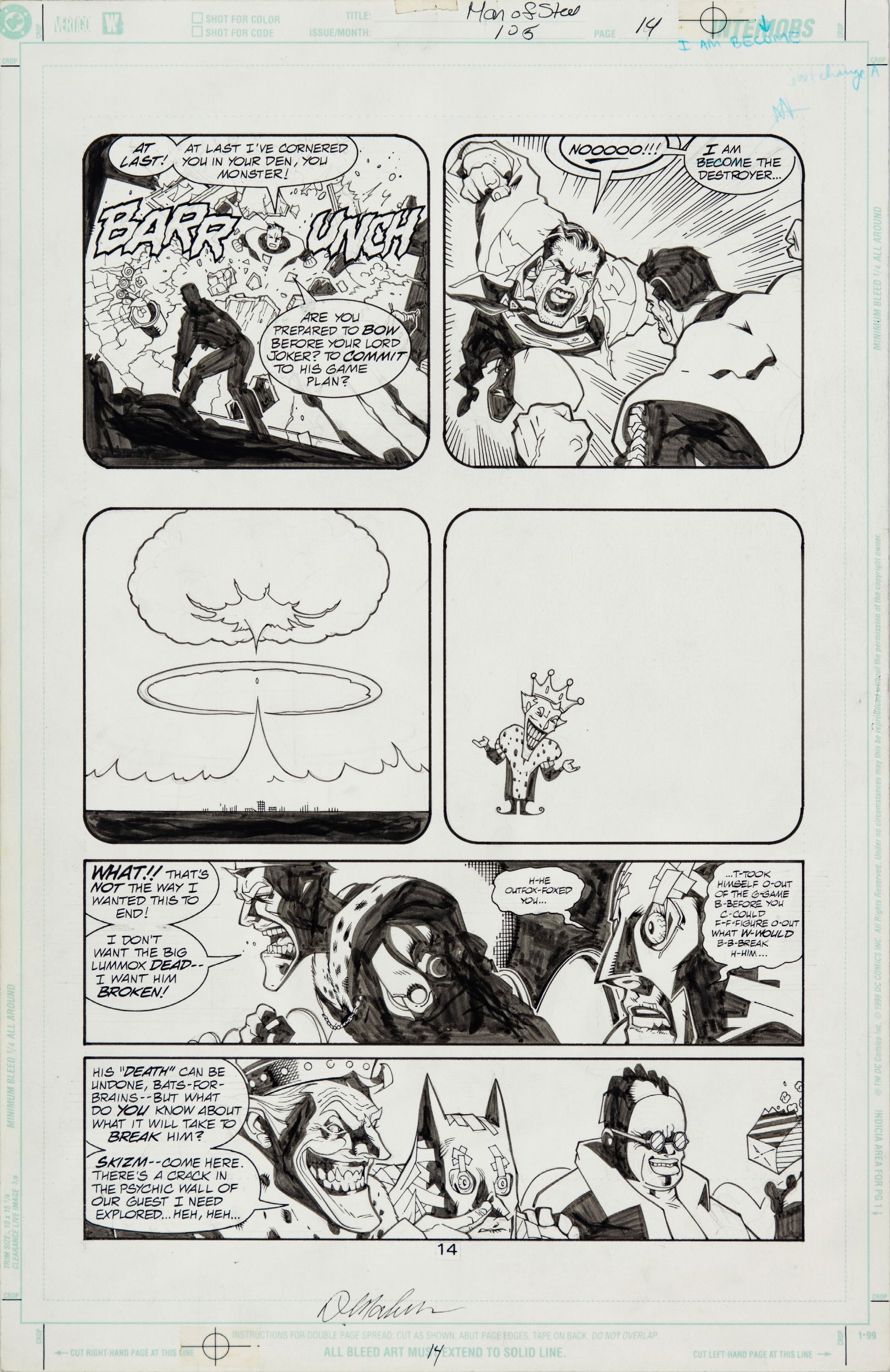 matita e china su cartoncino DC, 28 x 43 cm 2000 Tavola originale realizzata da Mahnke per 'The Reign of Emperor Joker', edita su Superman: The Man of Steel n. 105 a pag. 14 dalla DC nel 2000. Firmata.