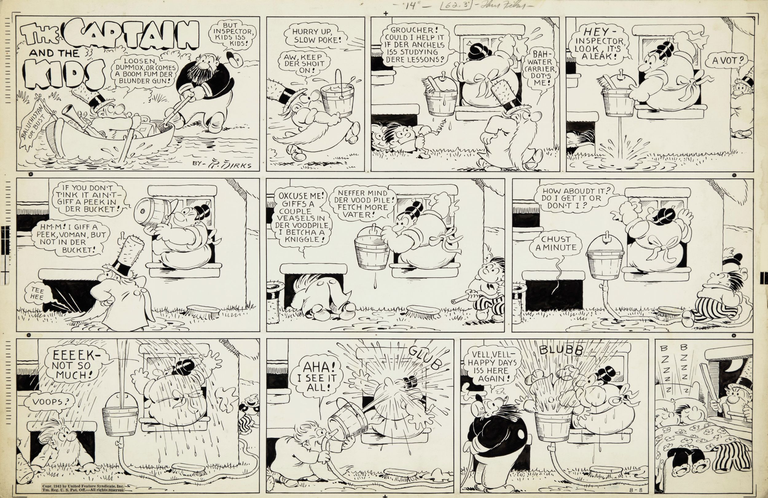 matita e china su cartoncino, 60 x 39 cm 1943 Tavola domenicale del 08/08/1943 per 'The Captain and the Kids'. Considerata la prima comic strip nella storia del fumetto americano a fare uso dei balloon; la striscia è nota in Italia soprattutto per essere stata pubblicata con grande successo, a partire dal 1912, sul C.d.P. come Bibì e Bibò e Capitan Cocoricò. Firmata e datata.
