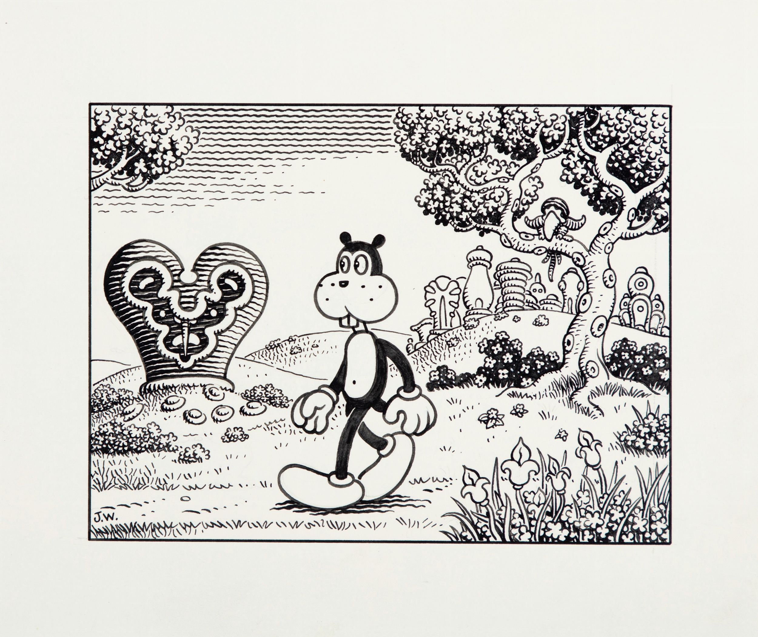 matita e china su cartoncino, 28 x 23,5 cm 2007 Illustrazione originale realizzata da Woodring per il volume 'The Hero With A Thousand Excuses', edita dallaTop Shelf nel 2007. Personaggi antropomorfi, paesaggi surreali e atmosfere oniriche sono il frutto del genio delle allucinazioni del maestro americano Woodring. Si allega la pubblicazione. Firmata.