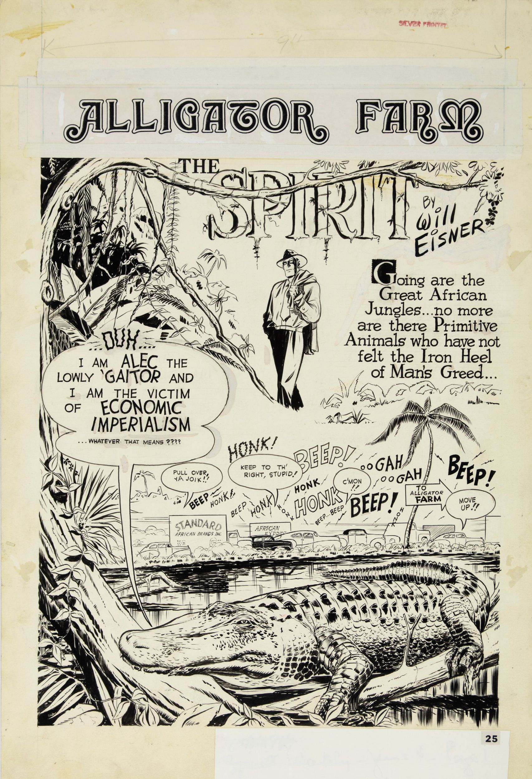 1950 Title page originale realizzata da Eisner per 'Alligator Farm', avventura di The Spirit pubblicata per la prima volta sui quotidiani americani il 4 Giugno 1950. Non tutte le storie di Eisner si svolgono nella grande metropoli, Eisner credeva nella nozione di città come un essere quasi vivente, che si rifletteva nelle sue storie di The Spirit, pertanto per i lettori era sempre uno shock quando le storie si svolgevano fuori da Central City, ma quando questo accadeva, le title page (segno distintivo della poetica di Eisner) risaltavano ancora di più del solito, come questa sbalorditiva title di 'Alligator Farm', che contrappone esplicitamente l'abitat incontaminato dell'alligatore al trambusto della città. Un altro segno distintivo di The Spirit, che veniva spesso esposto nelle title page, era il talento di Eisner nell'adottare prospettive non convenzionali per inquadrare le sue storie. Per spiazzare i giovani lettori alcune storie erano raccontate dal punto di vista di animali o persino di oggetti inanimati, in questo caso è lo stesso alligatore ad essere la voce narrante di questa avventura ambientata nell'Africa orientale; senza dubbio questa è un'estensione della stessa volontà di sperimentare che ha inaugurato l'originalità e il virtuosismo delle tanto ricercate title page di The Spirit. Un pezzo da museo.