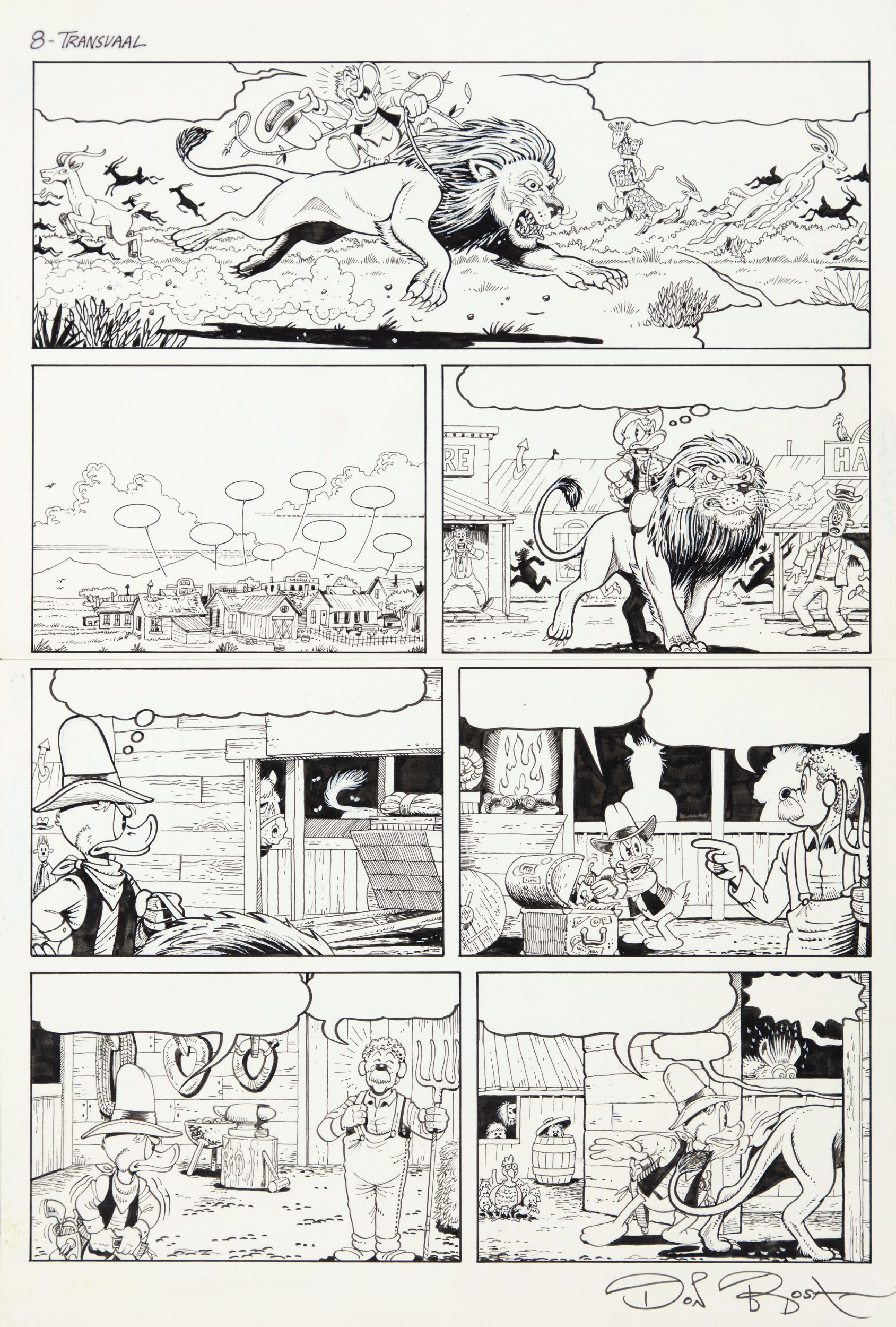 1993 Tavola originale realizzata da Rosa per 'The Terror Of The Transvaal', pagina 8 del sesto capitolo della celebra saga The Life and Times of Scrooge McDuck pubblicata per la prima volta in Danimarca nel 1993 e successivamente in Italia con il titolo 'Il terrore del Transvaal' su Zio Paperone n. 75 nel 1995. Nel 1886, alla ricerca dell'oro, Paperone giunge nel Transvaal, regione del Sudafrica. Arrivato nei pressi di Kimberley, sulla strada verso Johannesburg, il giovane Paperone soccorre un boero legato al dorso di un bufalo che poi gli spiega di essere rimasto impigliato nelle corde mentre cercava di catturarlo ma tacendo che in realtà i minatori di Kimberley lo hanno legato sul dorso della bestia e l'avevano così allontanato a causa dei suoi continui furti. Propostosi come guida, Paperone e il boero si dirigono verso Johannesburg. Si accampano nella savana e all'alba Paperone è solo e senza cavallo e viveri. Paperone esplode in un accesso d'ira contro il boero che lo spinge a domare un leone a cavallo del quale entra a Johannesburg. Qui ritrova il suo carro, recupera la sua sei colpi dal baule e armato entra nel saloon per affrontare il boero, che voleva rivendere i suoi attrezzi, ricoprendolo di pece e piume e poi trascinandolo in galera. Mentre se ne va, Paperone ricorda al boero che non farà strada se continuerà così, ma il boero, il cui nome si scopre essere Cuordipietra Famedoro, gli promette che ne farà di strada e diverrà così grande da mangiarsi i pesci piccoli come lui. Questa è la pagina in cui per la prima volta appare il leggendario 'baule dei ricordi', il tesoro più prezioso di Paperone. Su due pannelli. Firmata.