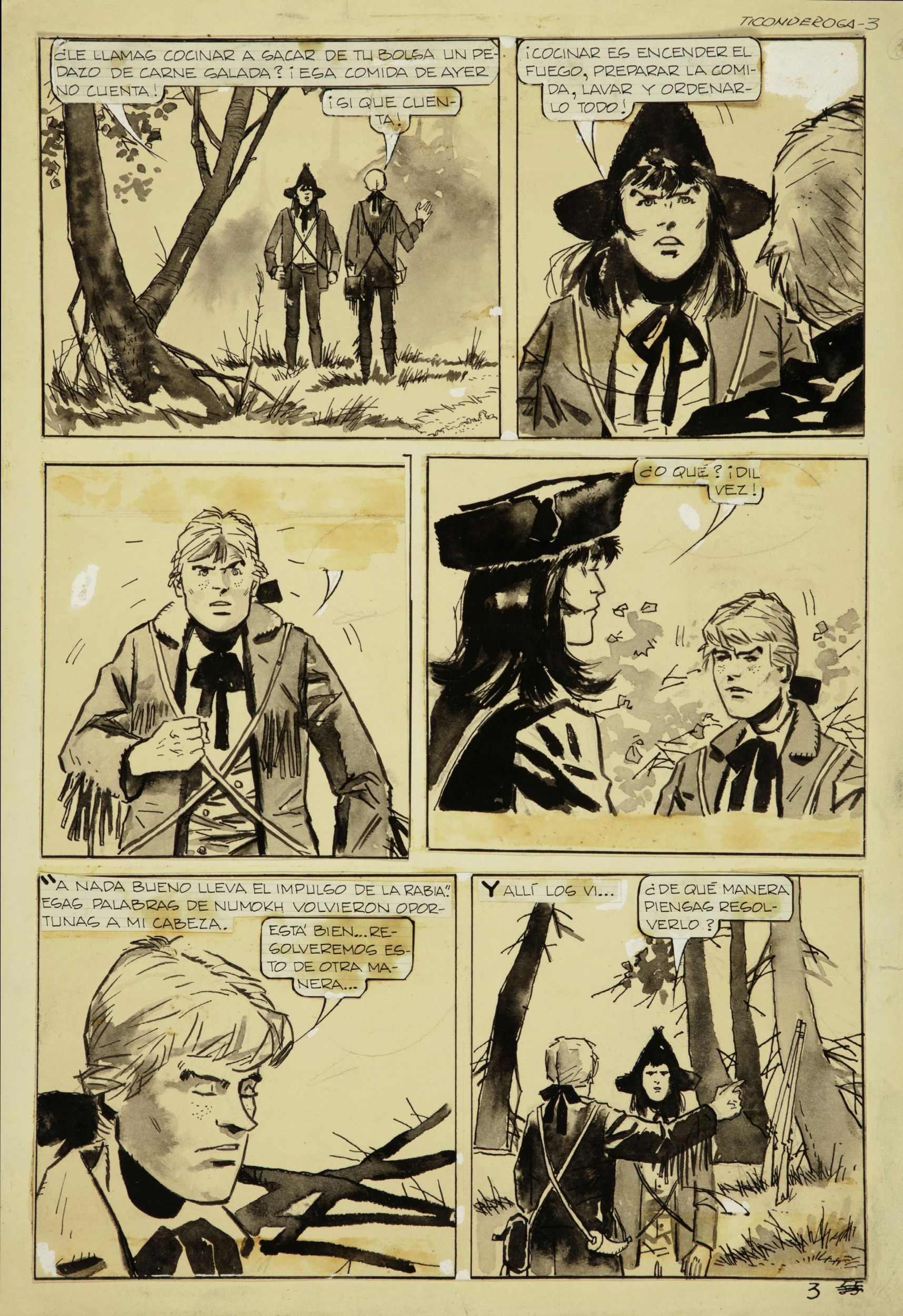 1957 Tavola originale realizzata da Pratt per 'Ticonderoga', pubblicata dall'Editorial Frontera nel 1957. In questa storia ambientata nel Nord America del XVIII secolo, durante le battaglie tra francesi e inglesi per la conquista dei territori dei Grandi Laghi, i protagonisti sono tre giovani: il cadetto di Sua Maestà Britannica Caleb Lee, lo smaliziato Joe Flint, detto Ticonderoga, e il nativo americano Numockh. I fondali dell'avventura sono costituiti da boschi, da foreste e da una natura selvaggia e incontaminata dove si muovono silenziosi i mocassini indiani a far da contrasto ai rumorosi spostamenti dei soldati venuti dall'Europa. In questo lavoro, Pratt utilizza la tecnica della mezza tinta, quasi a rendere più avvincente e fascinosa la simbiosi dell'uomo con la natura, rotta qui da una guerra che porterà, da lì a poco, alla nascita di una nazione. Piccolo strappo al margine destro. Testi di Héctor G. Oesterheld.