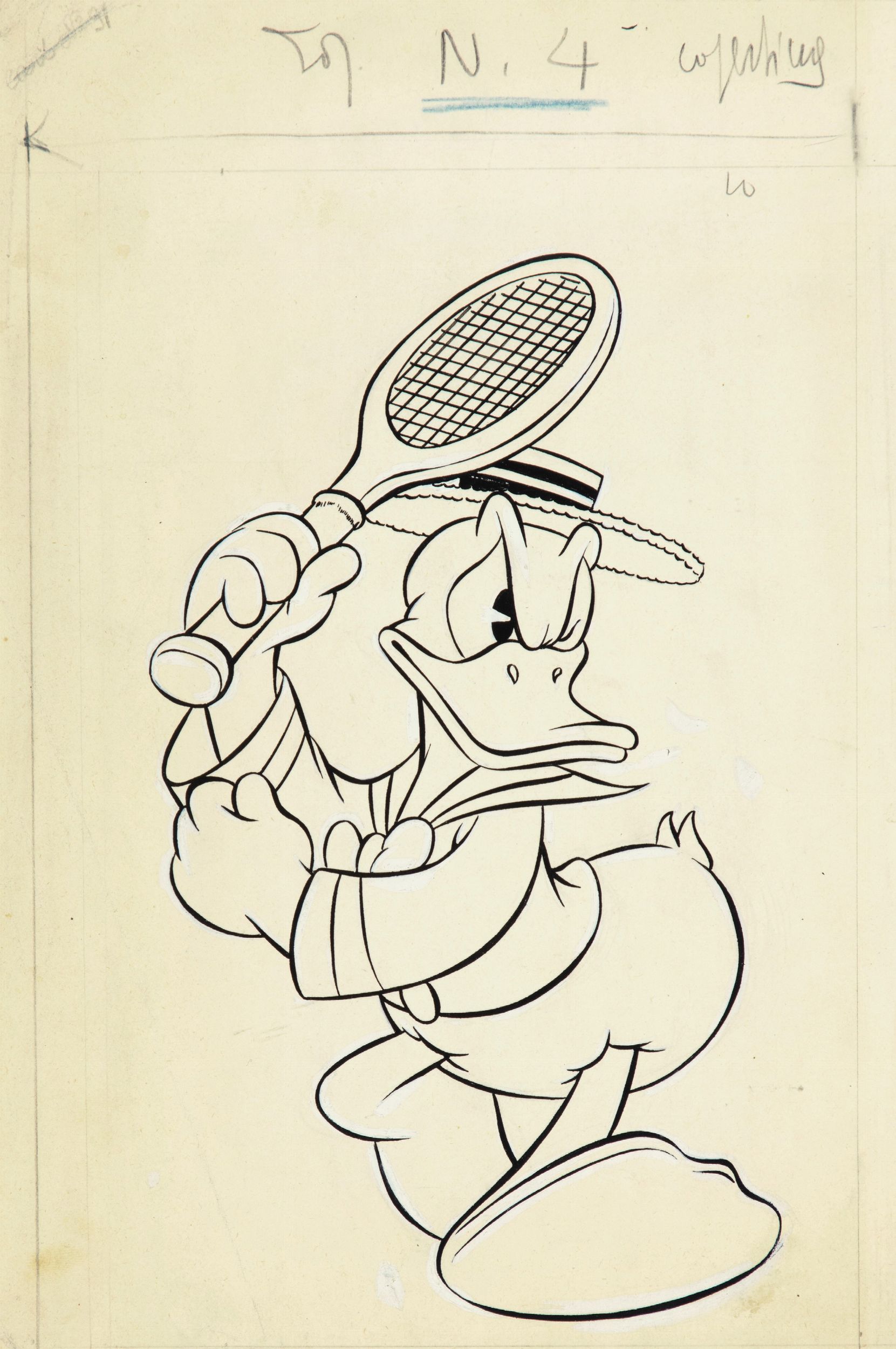 matita, china e biacca su cartoncino, 19 x 28 cm 1949 Disegno originale per la quarta di copertina realizzato da Vergani per Topolino n. 4 edito dalla Mondadori nel Luglio 1949. Tra i più iconici ritratti di Paperino 'prima maniera' mai realizzati in Italia. La più antica copertina di Topolino mai apparsa sul mercato, un pezzo da museo. Lieve piega all'angolo inferiore sinistro e piega all'angolo superiore sinistro.