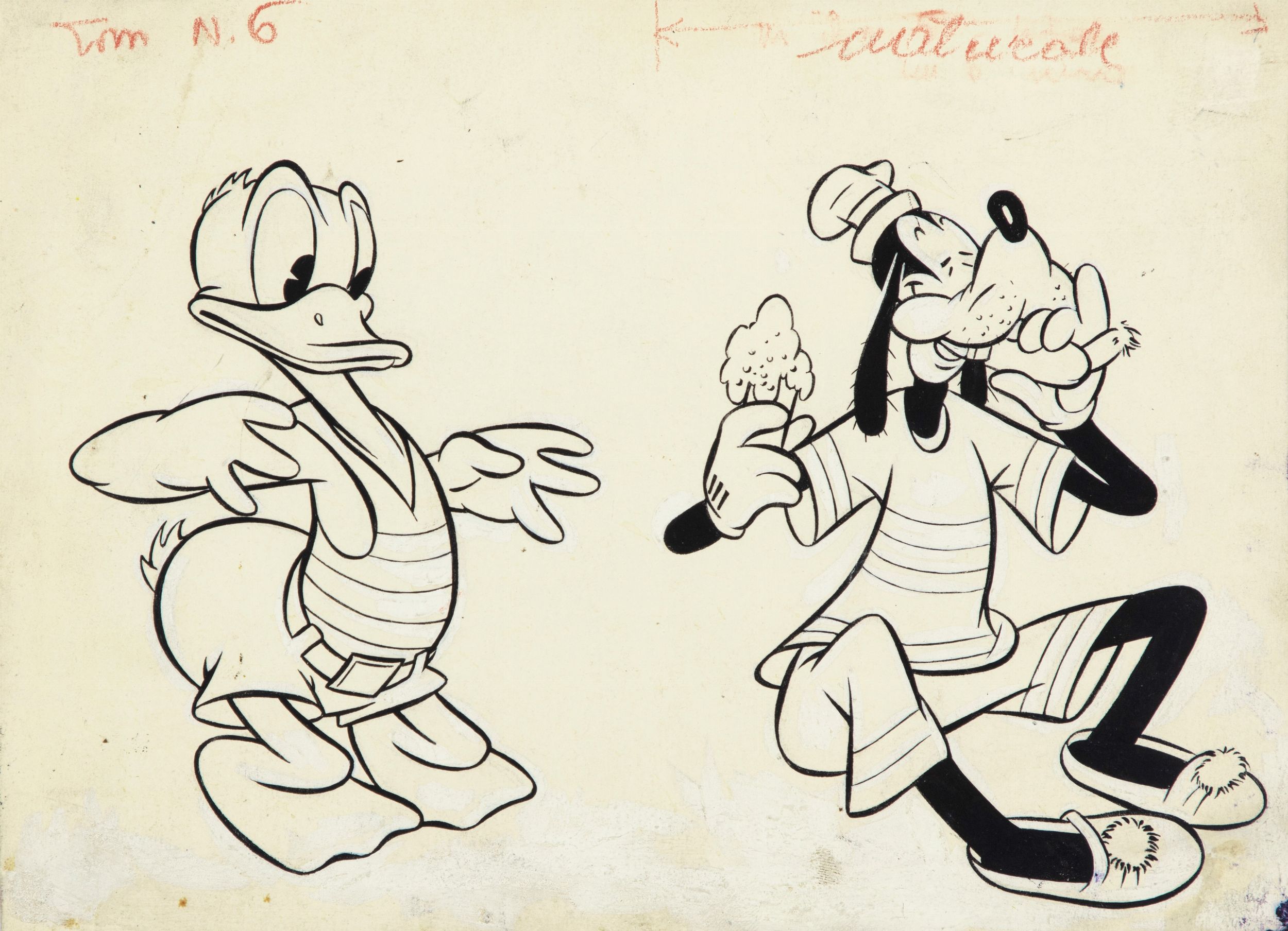 matita, china e biacca su cartoncino, 25,5 x 18,5 cm 1949 Originale di copertina realizzato da Vergani per Topolino n. 6 edito dalla Mondadori nel Settembre 1949. L'irresistibile coppia Paperino e Pippo qui in uno dei più iconici ritratti ad opera del primo copertinista di Topolino. Un pezzo da museo.