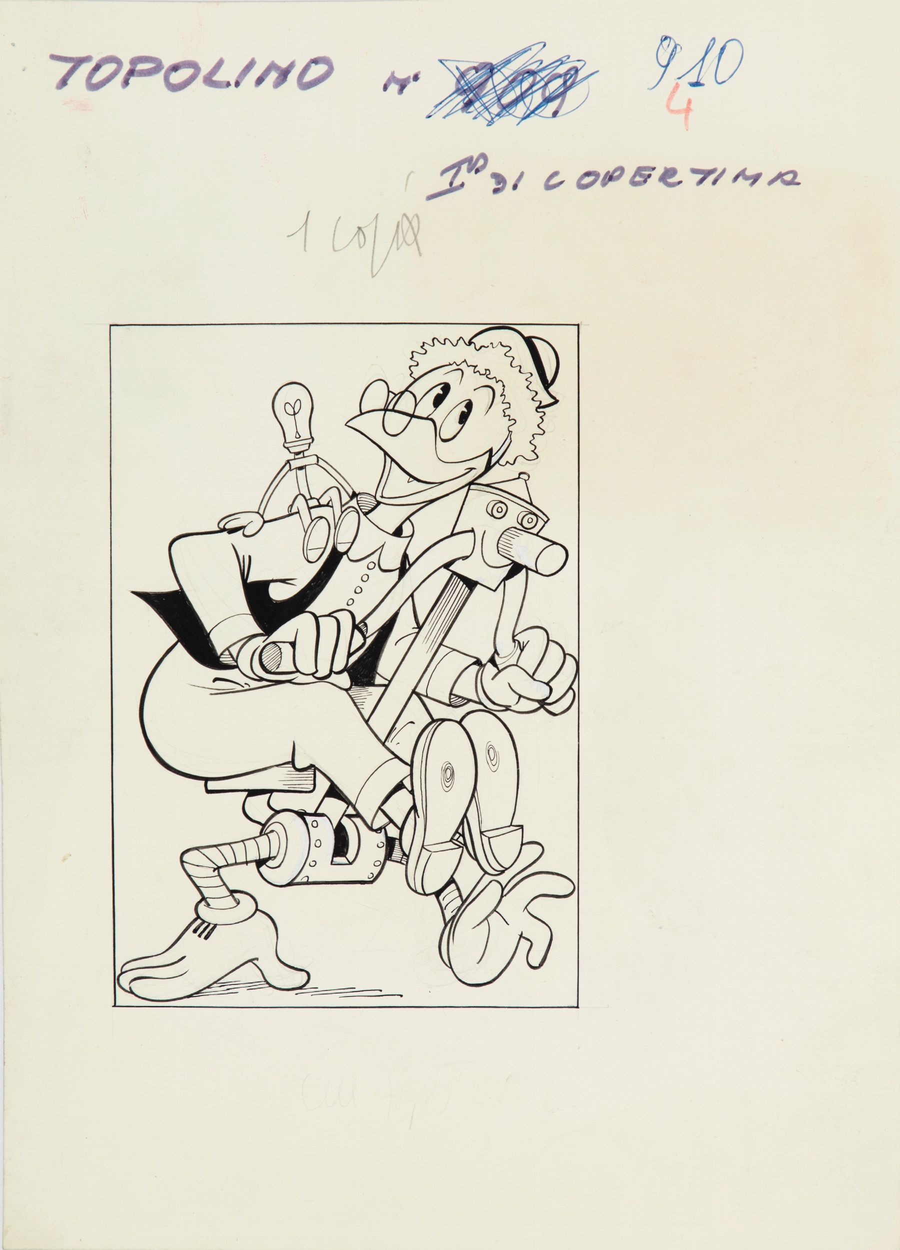 matita e china su cartoncino, 21 x 29 cm 1973 Originale di copertina realizzato da Carpi per Topolino n. 910 edito dalla Mondadori nel giugno 1973. Una delle celebri copertine dell‘Operazione Quack, in cui era allegato in omaggio un francobollo metallico. Si allega la prova colore a tempera su carta (32 x 22 cm).