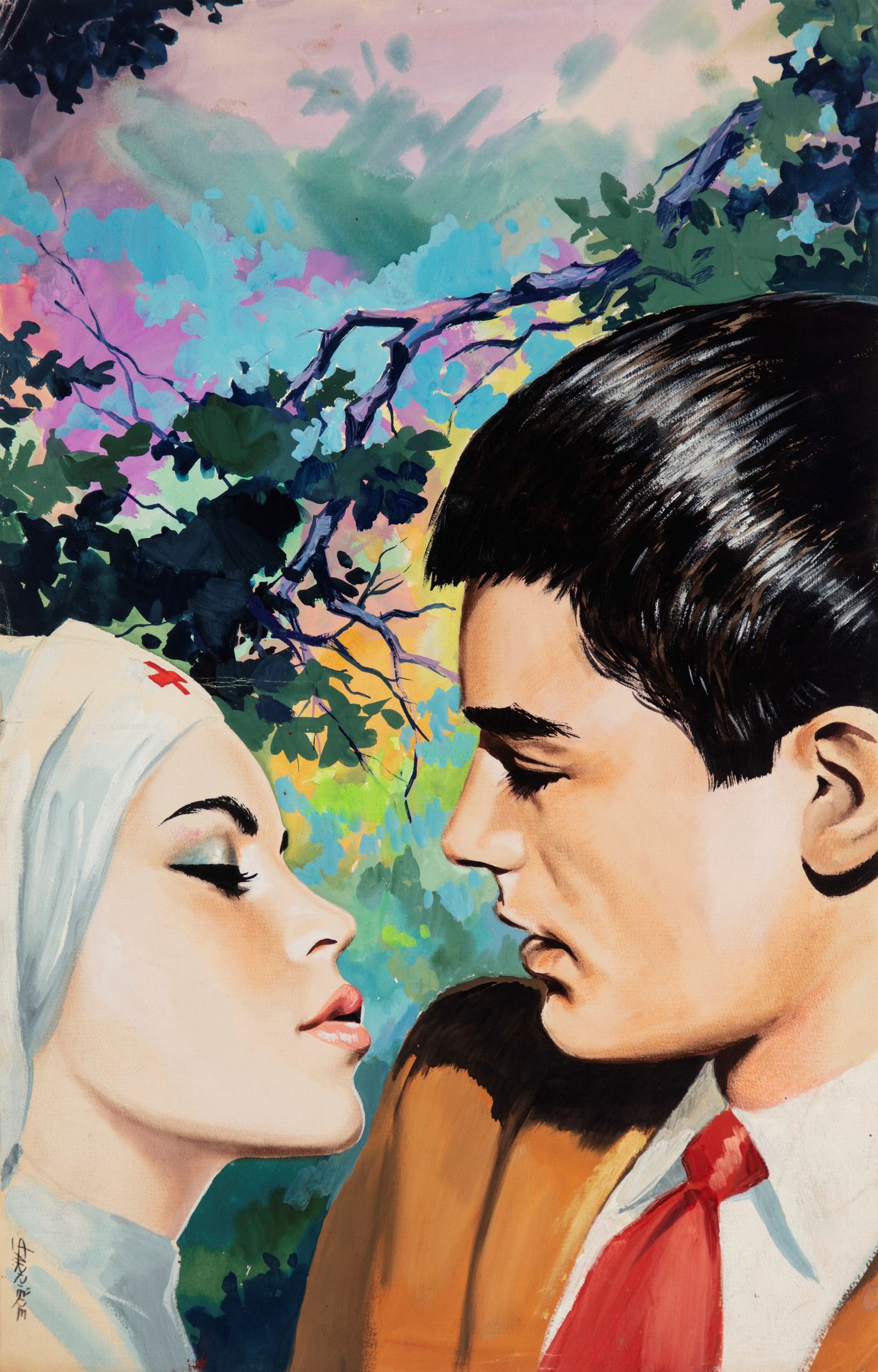 tempera su cartoncino, 29,5 x 46,5 cm 1964 Originale di copertina realizzato da Carrière per il romanzo 'Trois amoureux en peine' di Hélène Roudaud, edito nella collana Mirabelle n. 164 dalle Editions des Remparts nel 1964. Lievi pieghe agli angoli. Firmato.