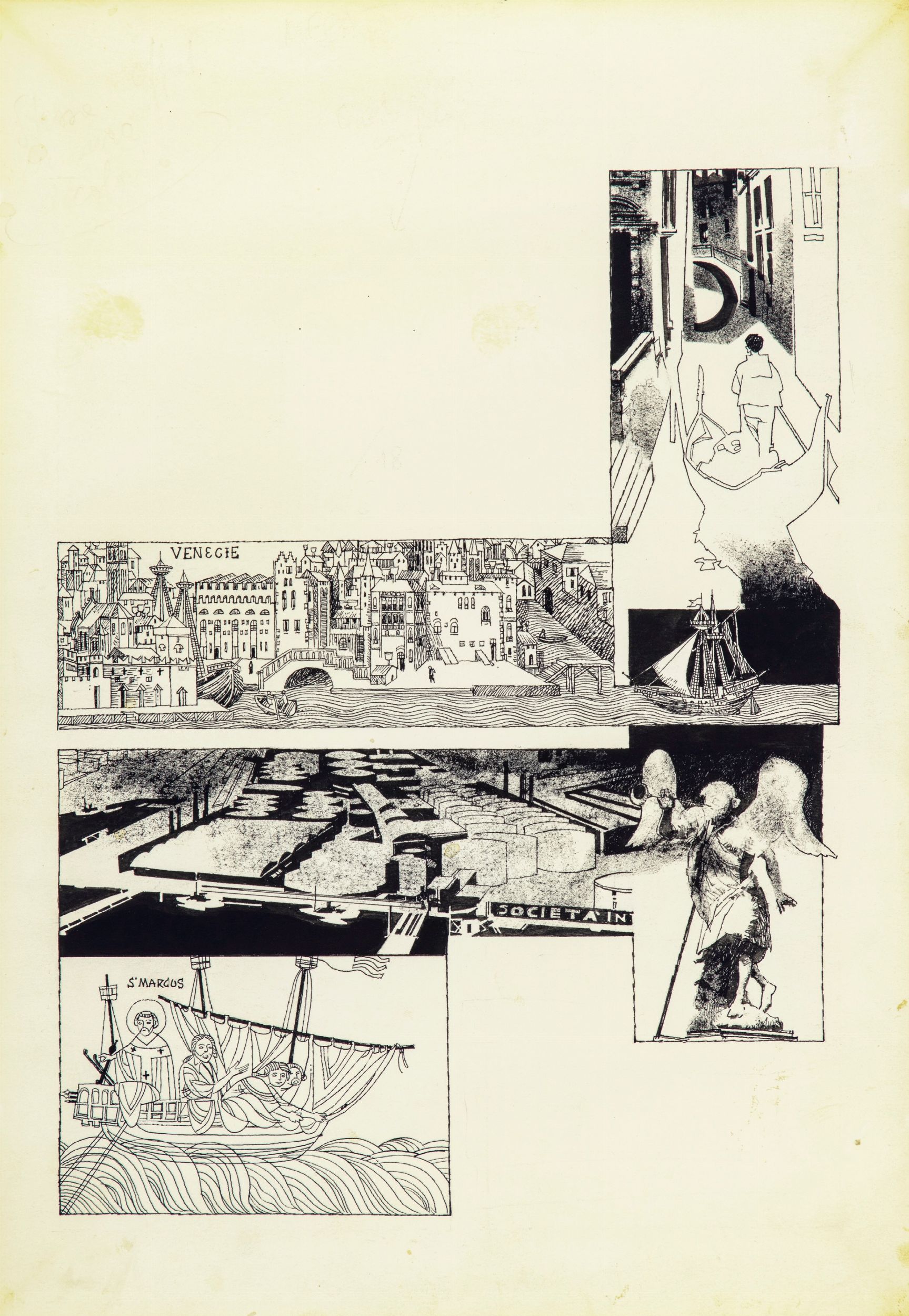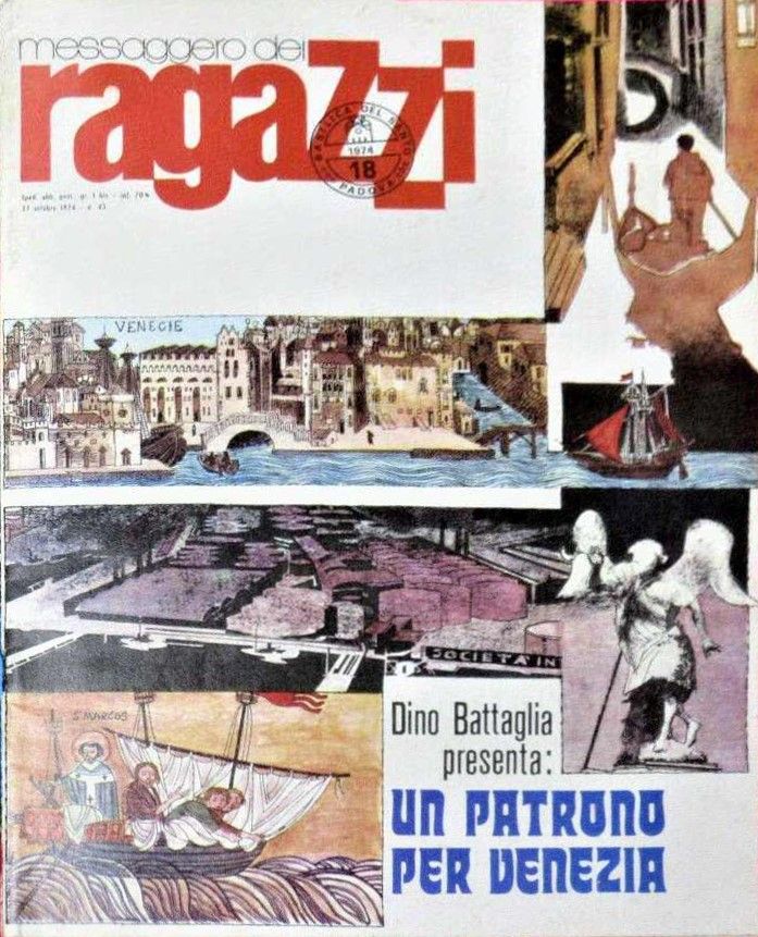 matita e china su cartoncino, 25 x 36 cm 1974 Originale di copertina realizzato da Battaglia per il Messaggero dei Ragazzi n. 18 del 1974. L'amore di Battaglia per la sua città natale traspare in questo lavoro dedicato alla città lagunare pur sapendo riconoscere i suoi pregi come i suoi difetti: > Lieve piega al margine destro. Acquerellata al retro.