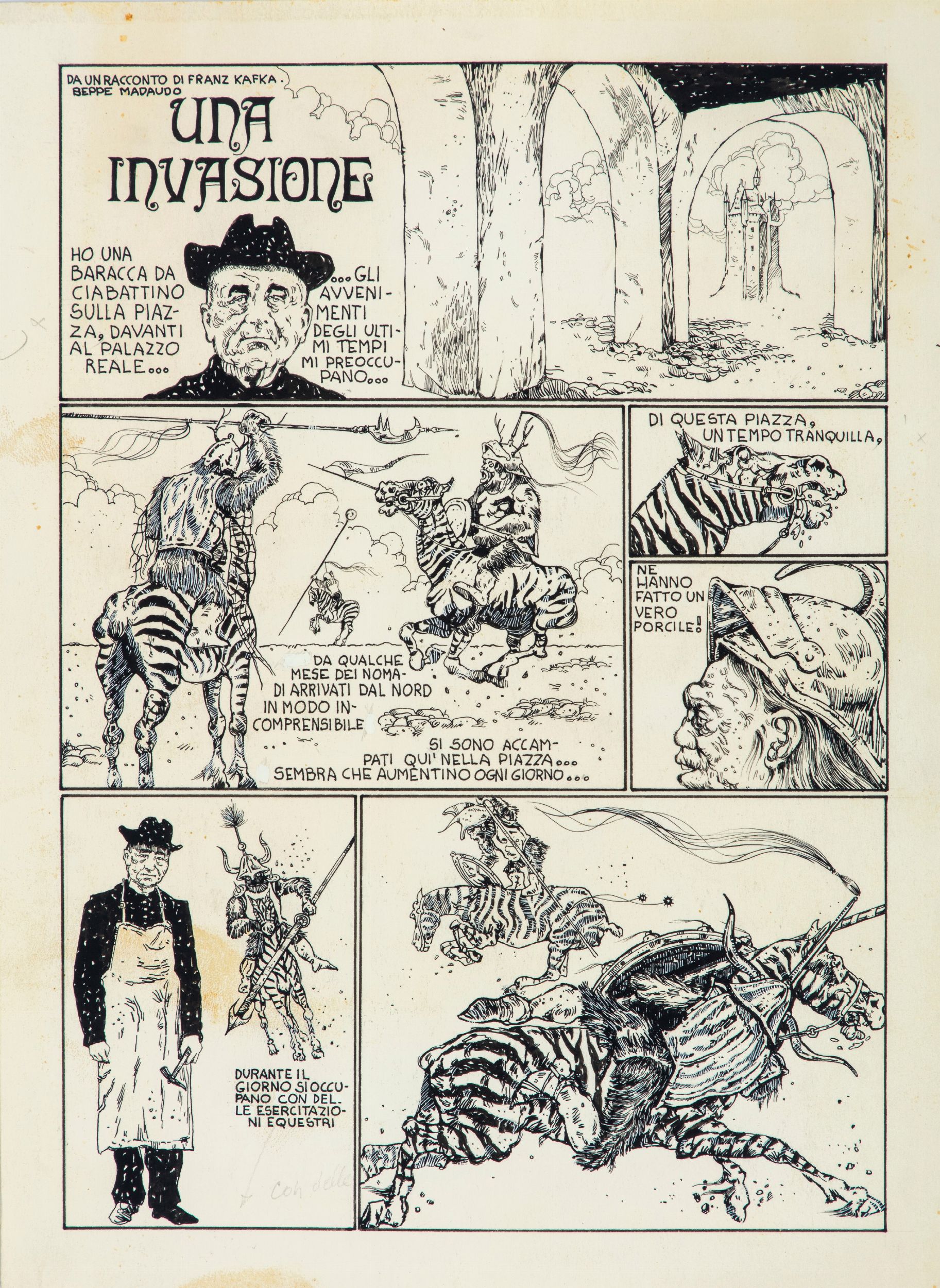 matita e china su cartoncino, 30 x 41 cm ciascuno 1975 Storia completa composta da 3 tavole originali realizzate da Madaudo per 'Una invasione', trasposizione del celebre racconto di Franz Kafka pubblicato sulle pagine della rivista Sgt. Kirk n. 42 del 1975.