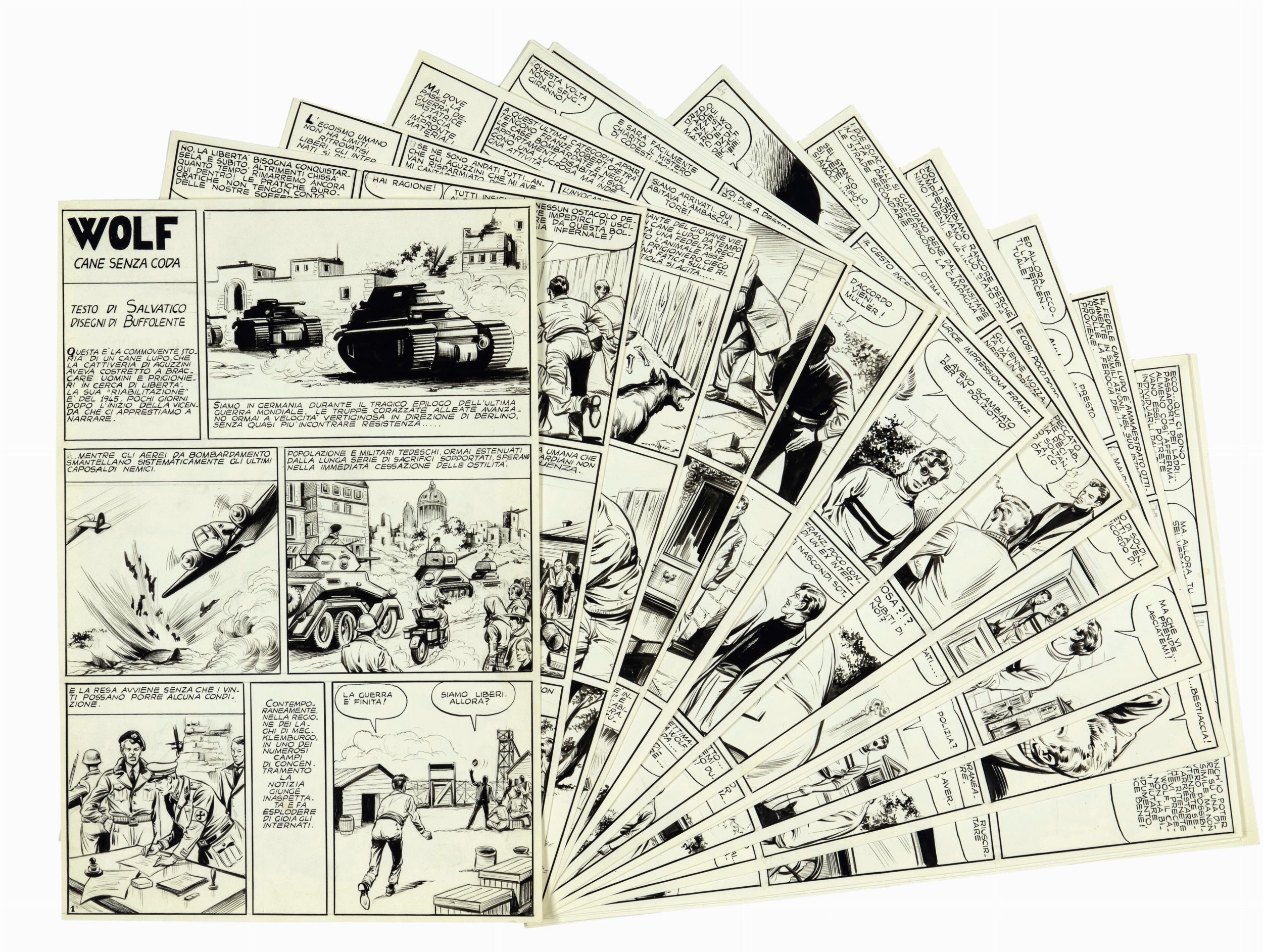 matita e china su cartoncino, 21,5 x 32,5 cm ciascuno anni 50 Storia completa composta da 18 tavole originali realizzate dalla Buffolente per 'Wolf: cane senza coda', storia pubblicata sugli Albi del Vittorioso nei primi anni '50. Firmata nell'ultima pagina.