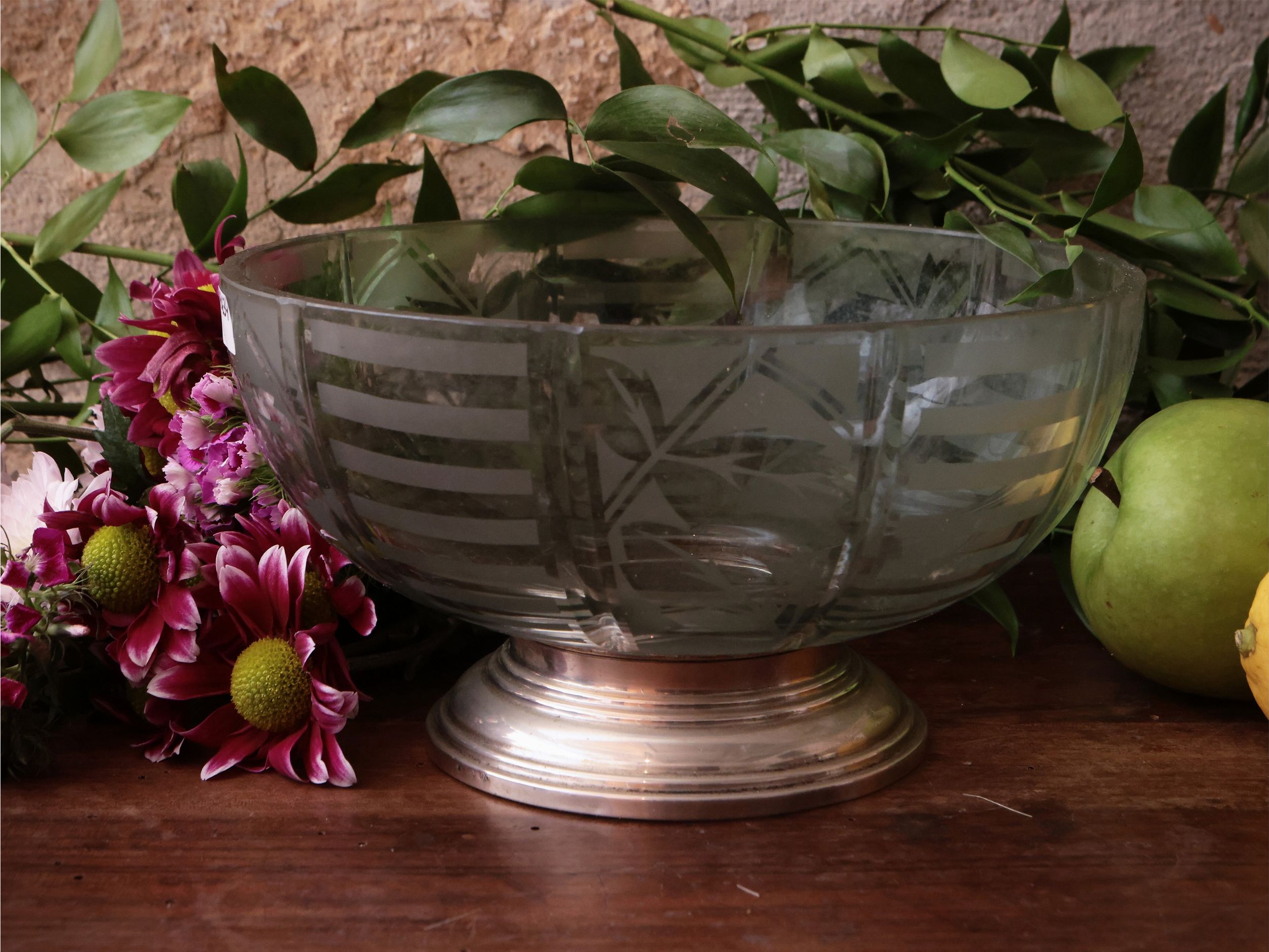Alzata centrotavola di gusto Art Decò in cristallo fumè e argento