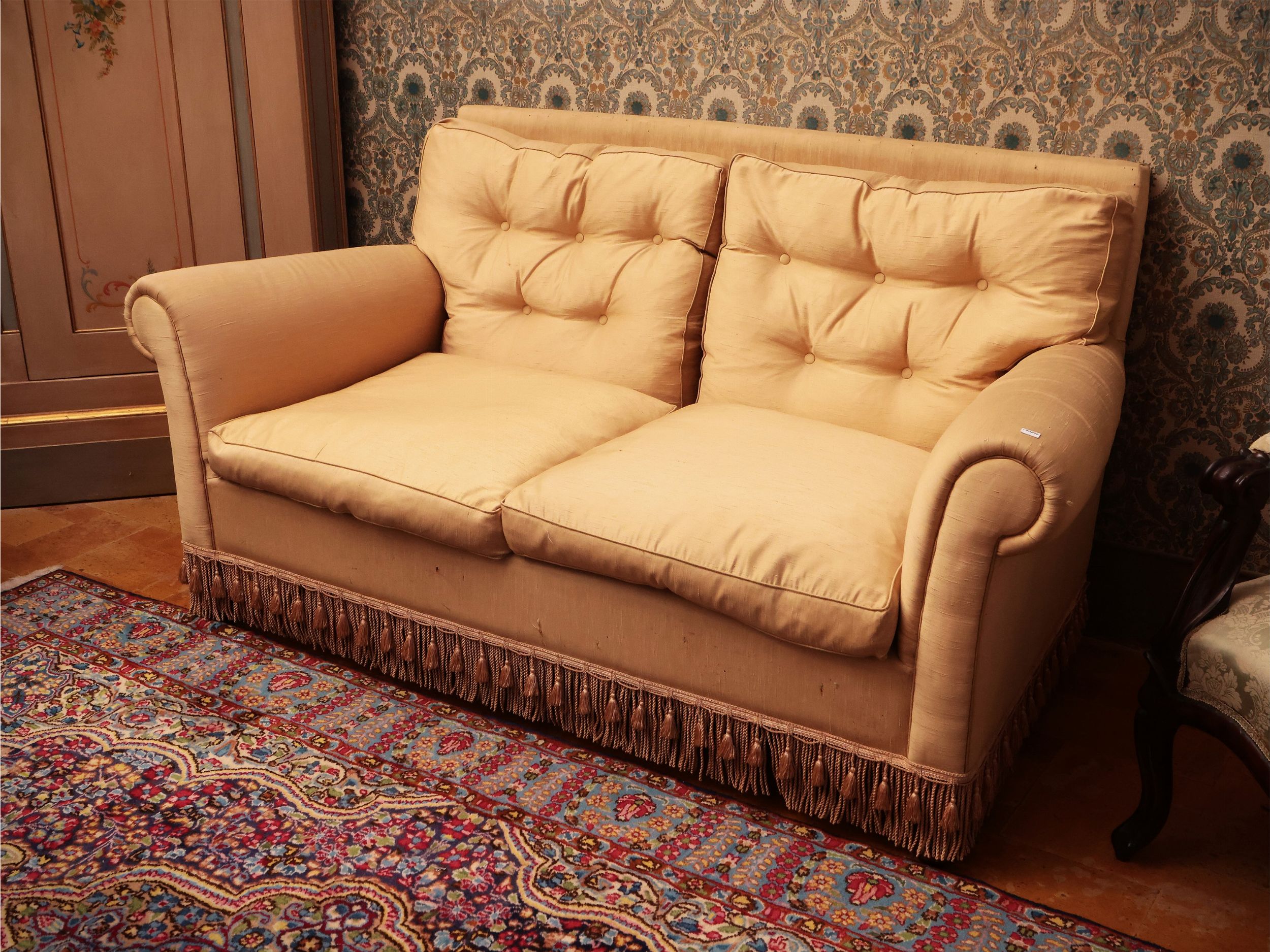 Divano a due posti rivestito in seta giallo crema
