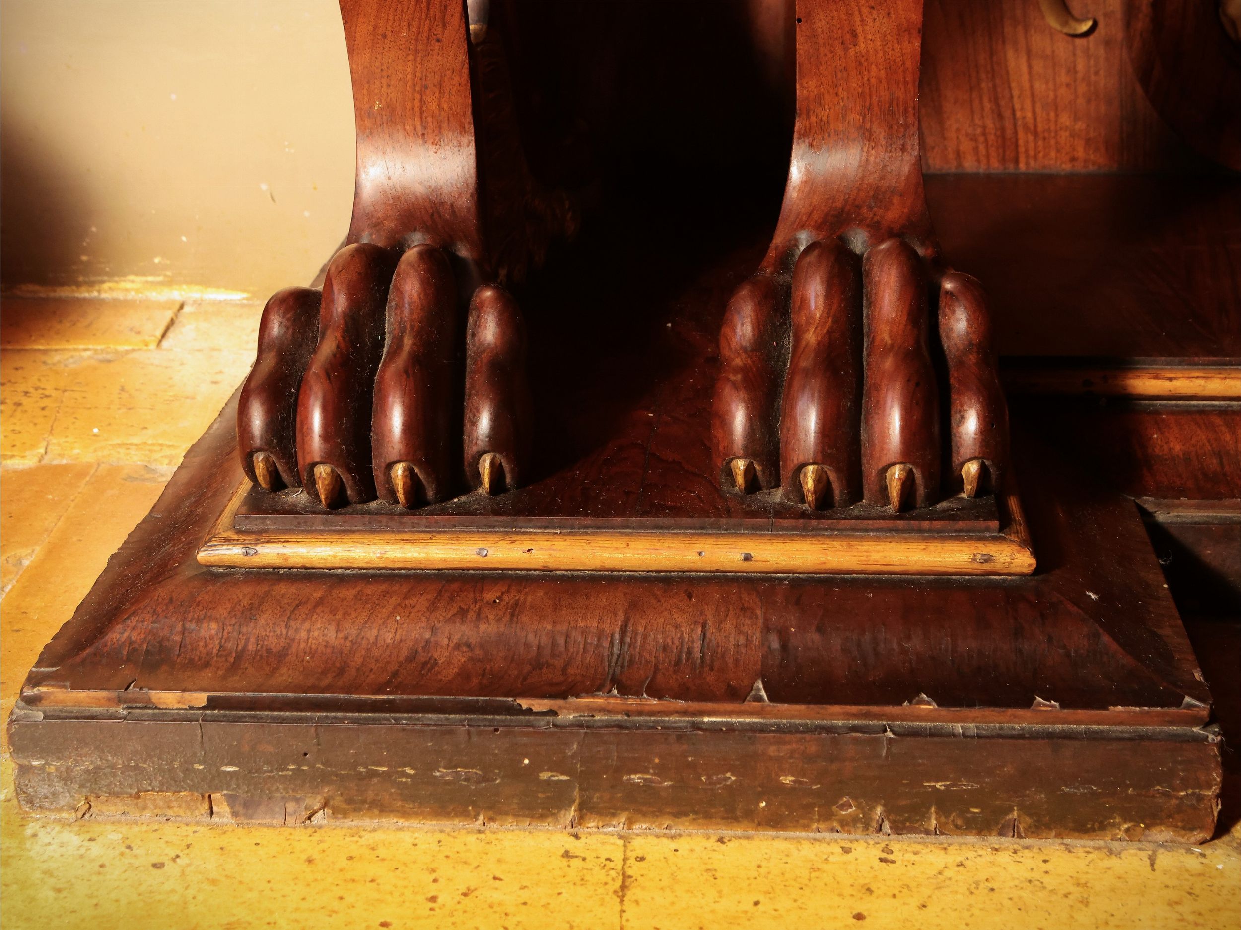 h cm 100x138x68 XIX secolo piano incassato in marmo bianco, alta fascia poggiante su doppi sostegni a volute cuoriformi contrapposte lumeggiati in oro e desinenti a zampa ferina base sagomata con bordura modanata, a decorare il fondo ampio intaglio a volute e palmette