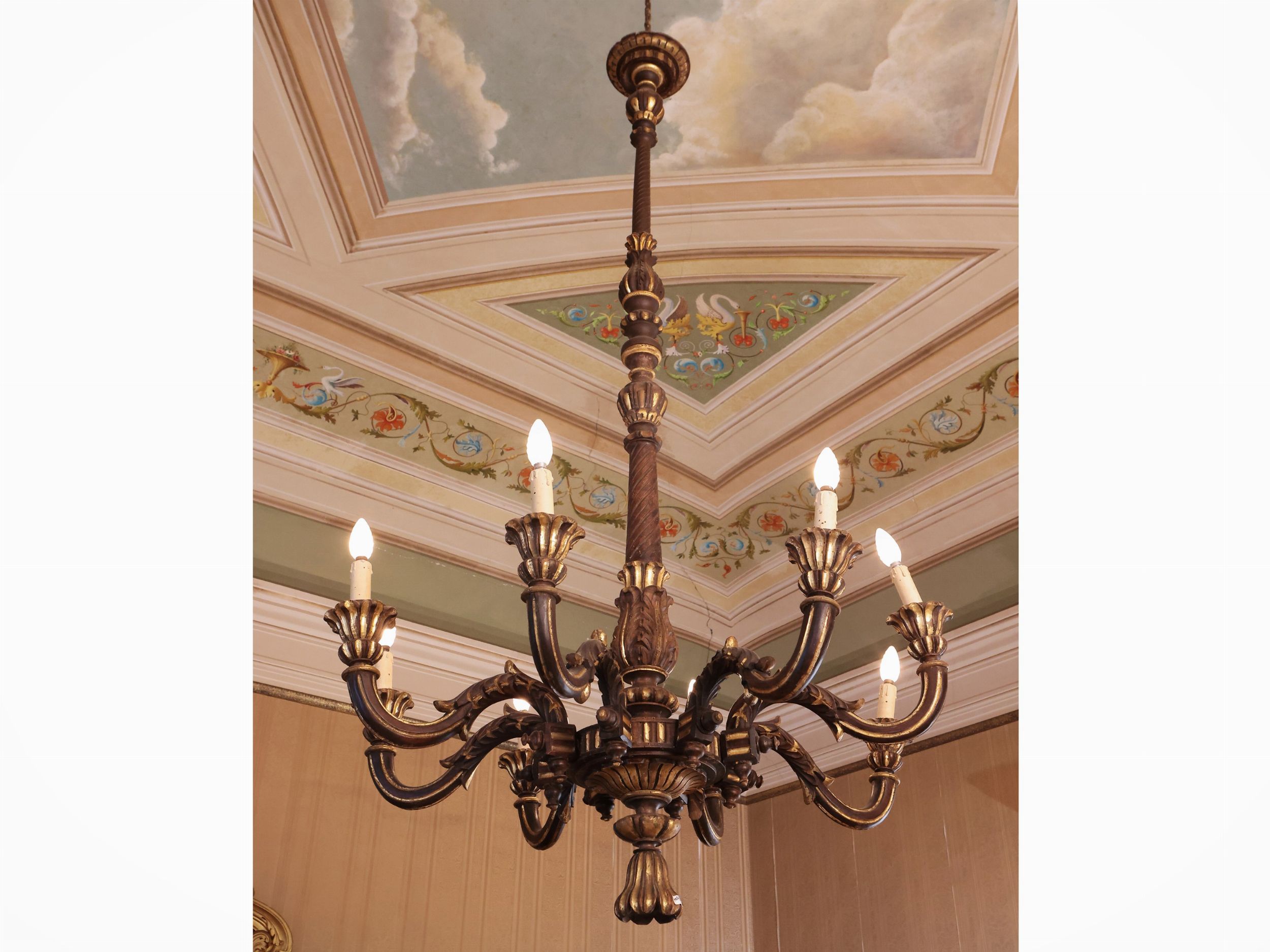 Grande lampadario in legno intagliato e lumeggiato in oro