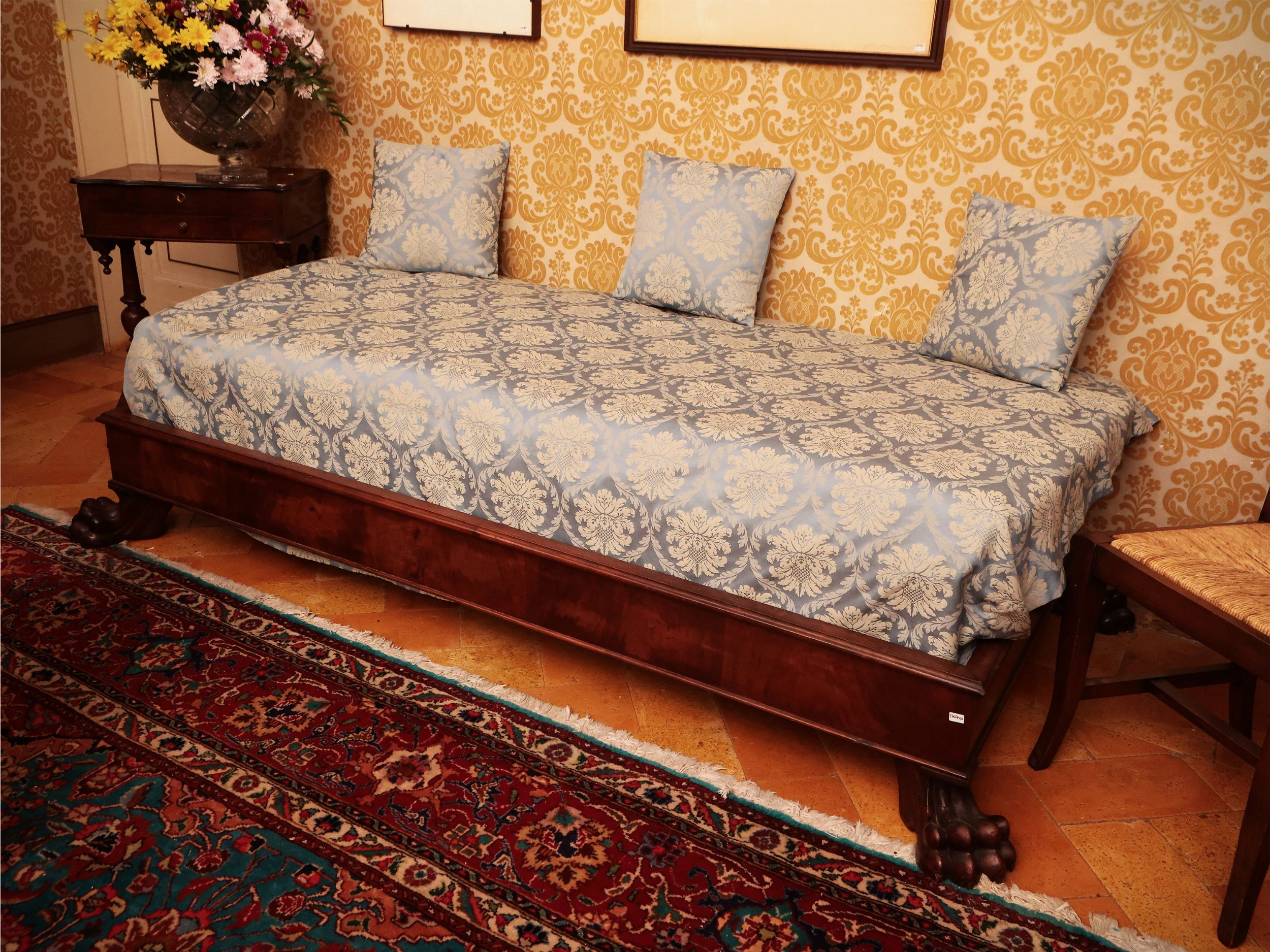 seconda metà del XIX secolo alta fascia con quattro piedi ferini aggettanti, corredato da rivestimento e cuscini in tessuto damascato azzurro