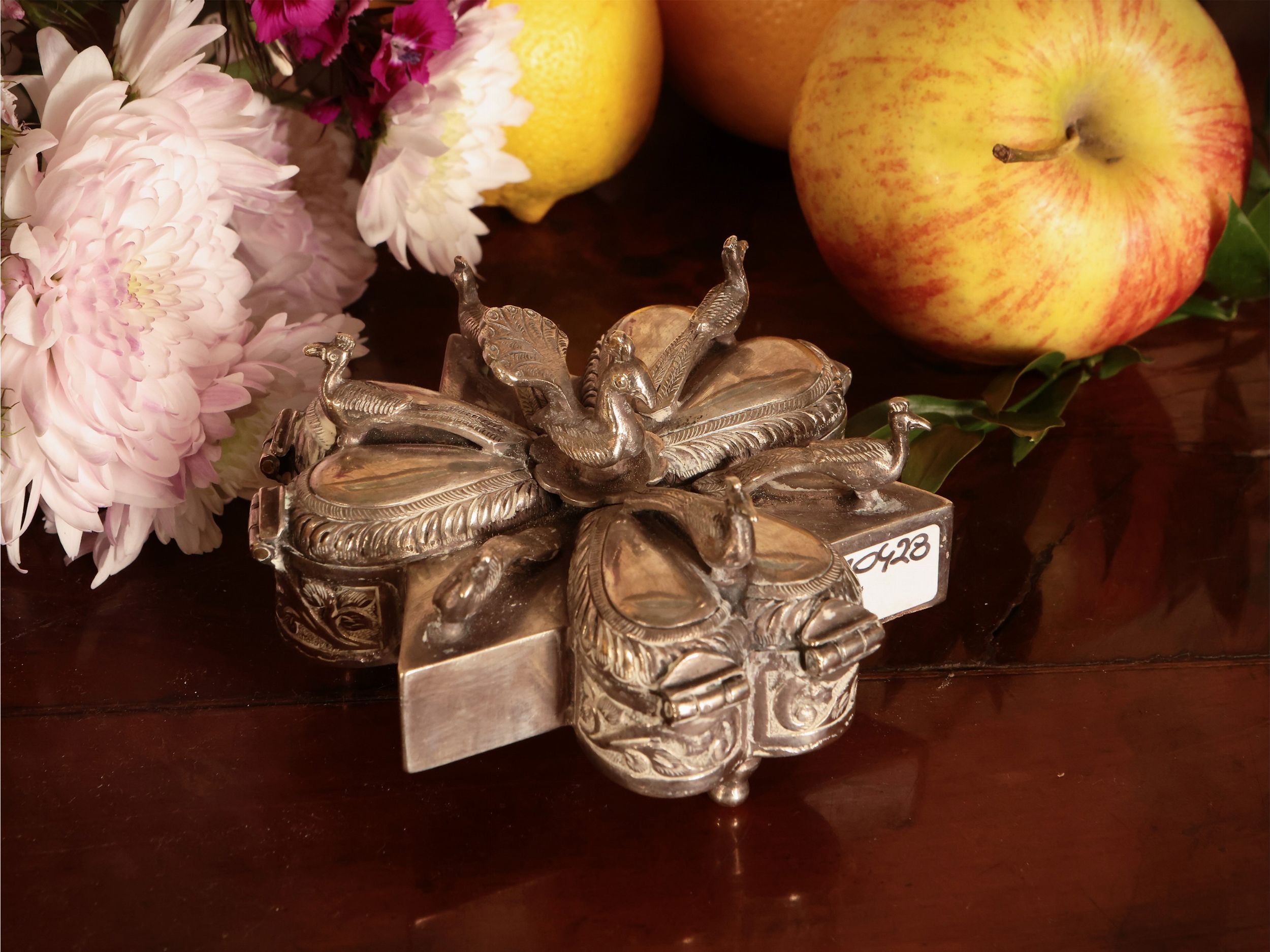 probabilmente India, prima metà del XX secolo di forma sagomata, interamente sbalzata con motivi vegetali e sormontata sa figure di pavoni modellate a tutto tondo