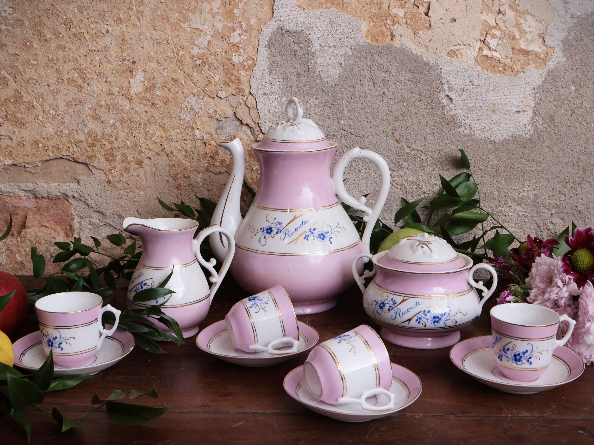 prima metà del XX secolo dipinto nei toni del lilla, composto da caffettiera, lattiera, zuccheriera e serie di 10 tazzine corredate da piattino