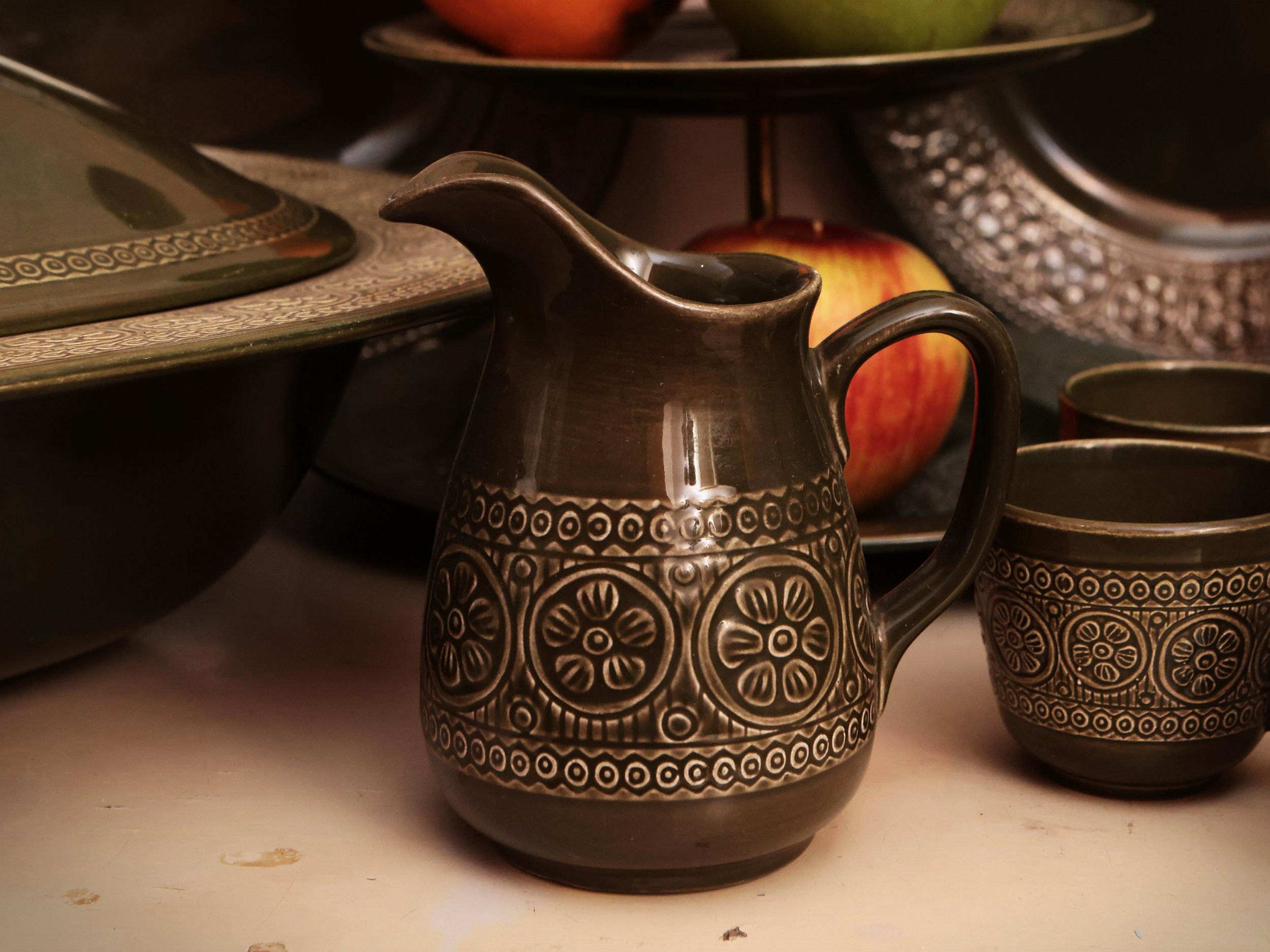 Servizio di piatti in ceramica smaltata verde oliva, Laveno