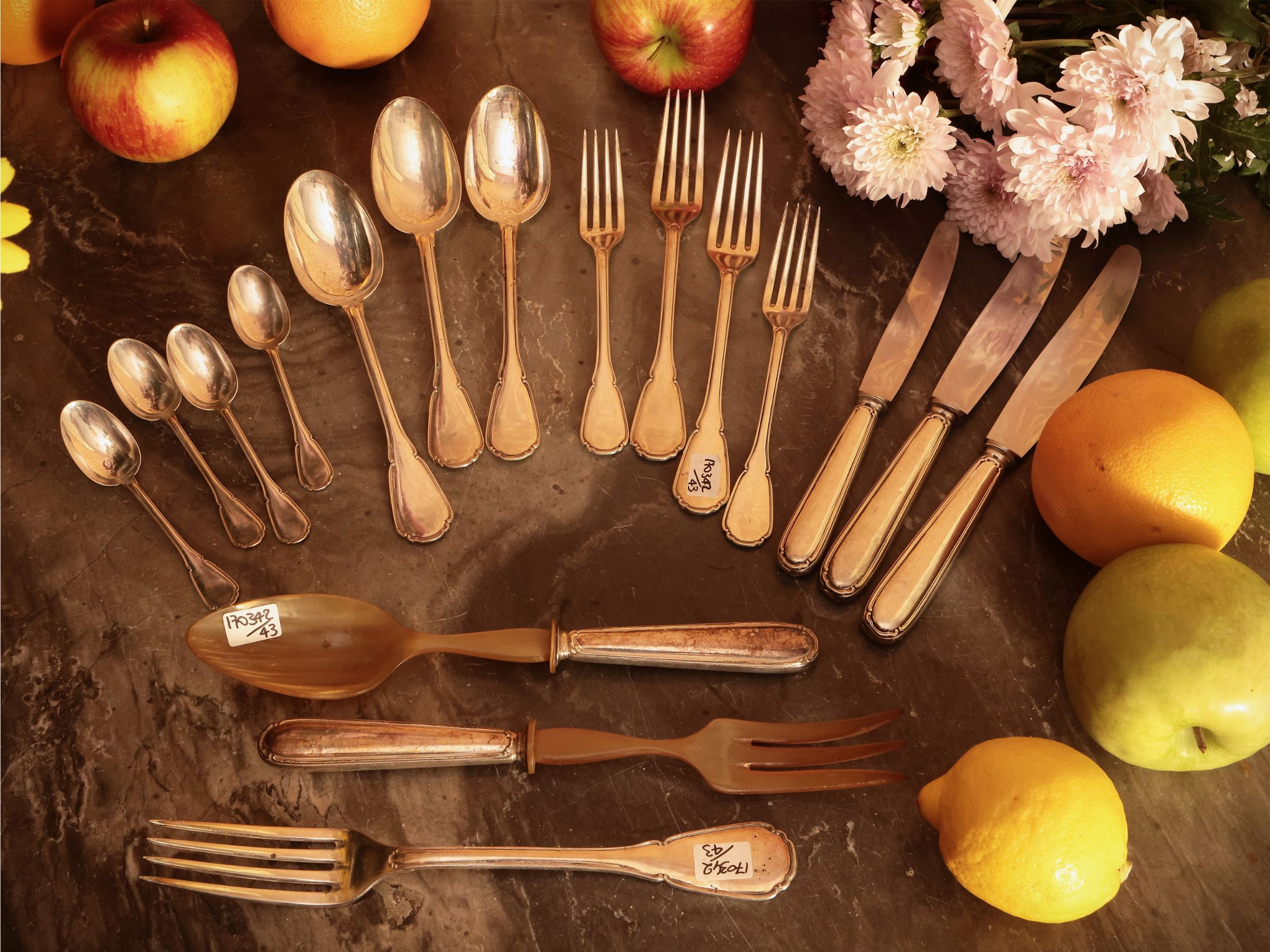 gr complessivi netti esclusi i coltelli 1350 (43) Anni Trenta manico trilobato con volute, completo per sei persone, composto da 6 forchette, 6 coltelli, 6 cucchiai, 6 forchettine e coltellini da frutta, 10 cucchiaini, 2 posate da portata da insalata ed una forchetta a servire