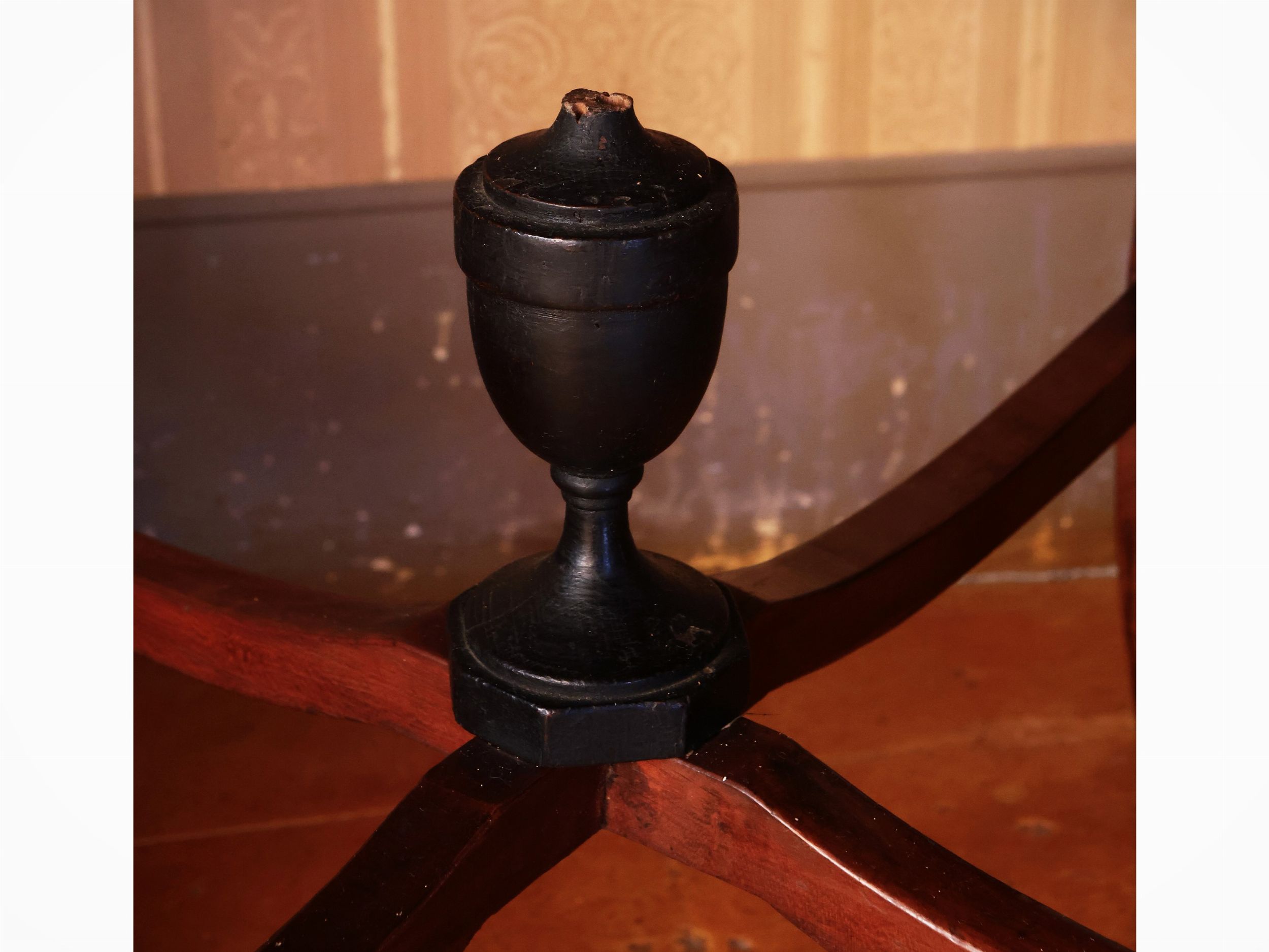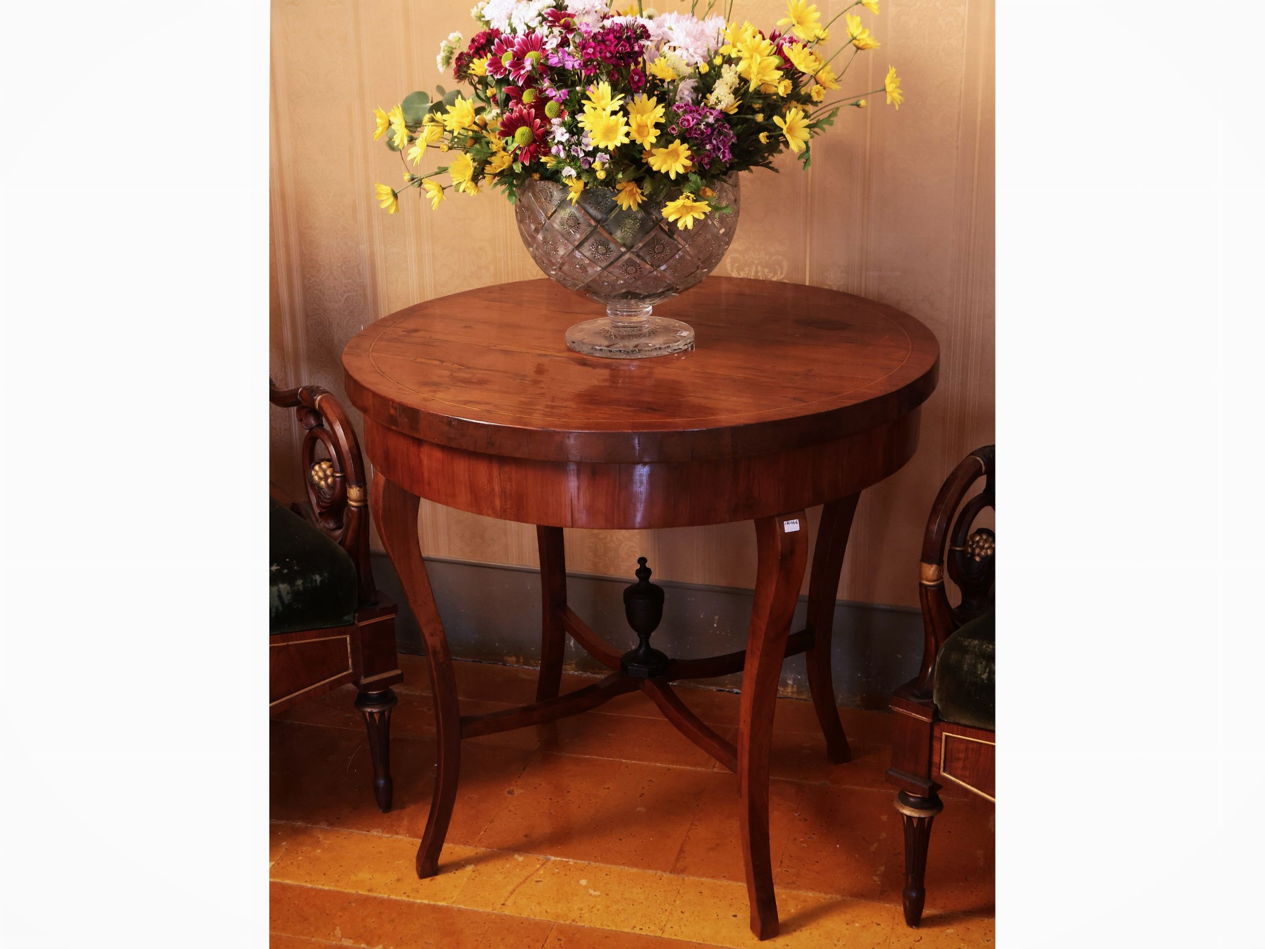 inizio del XIX secolo piano circolare (difetti) intarsiato con filettatura, quattro gambe sinuose riunite da traversa a crociera con finale a vaso ebanizzato