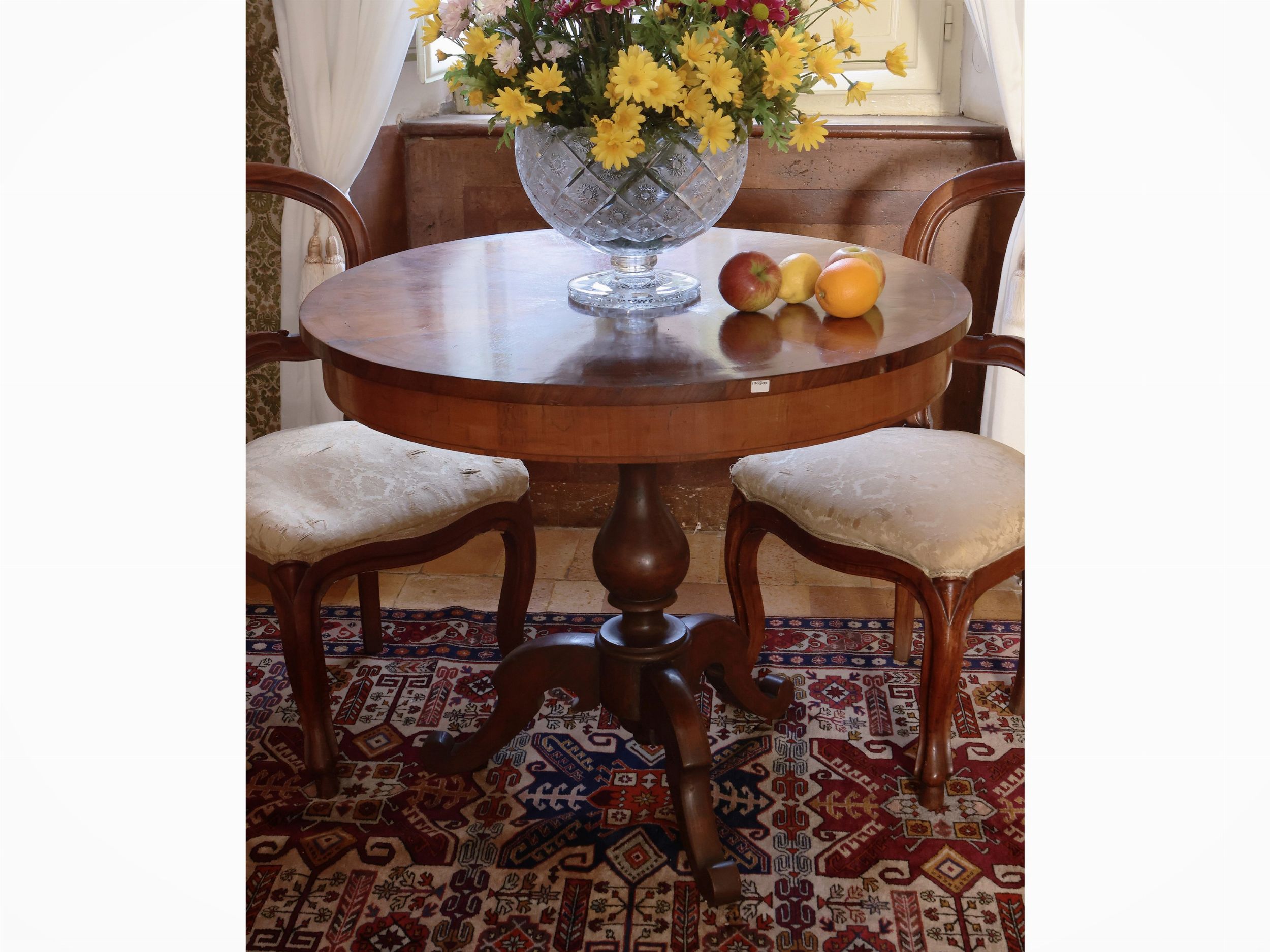 metà del XIX secolo piano circolare intarsiato con filettature a formare rosoni, sostegno centrale tornito, su tre piedi a doppia voluta, alcuni difetti