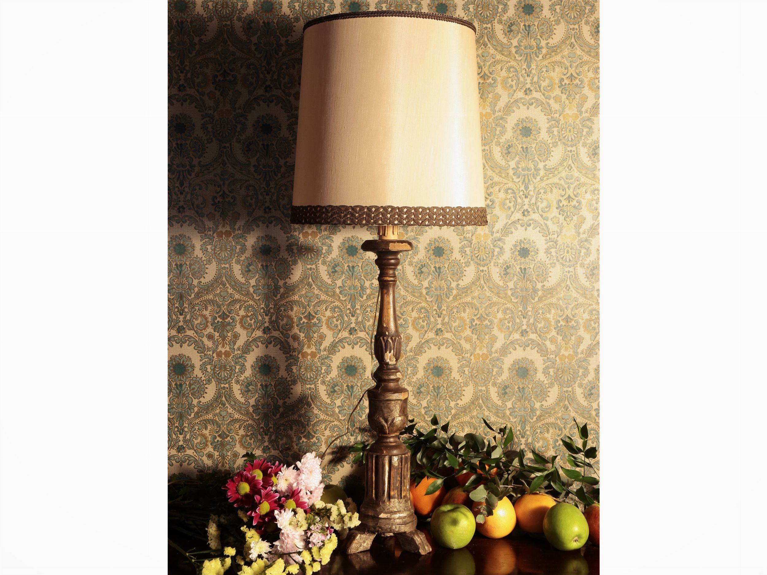 XIX secolo fusto tornito, base a plinto su tripode, montata a lume e corredata da paralume in tessuto avorio con dettagli in passamaneria, lievi difetti