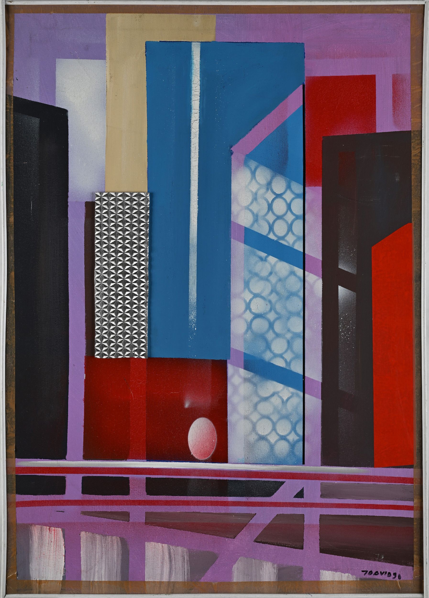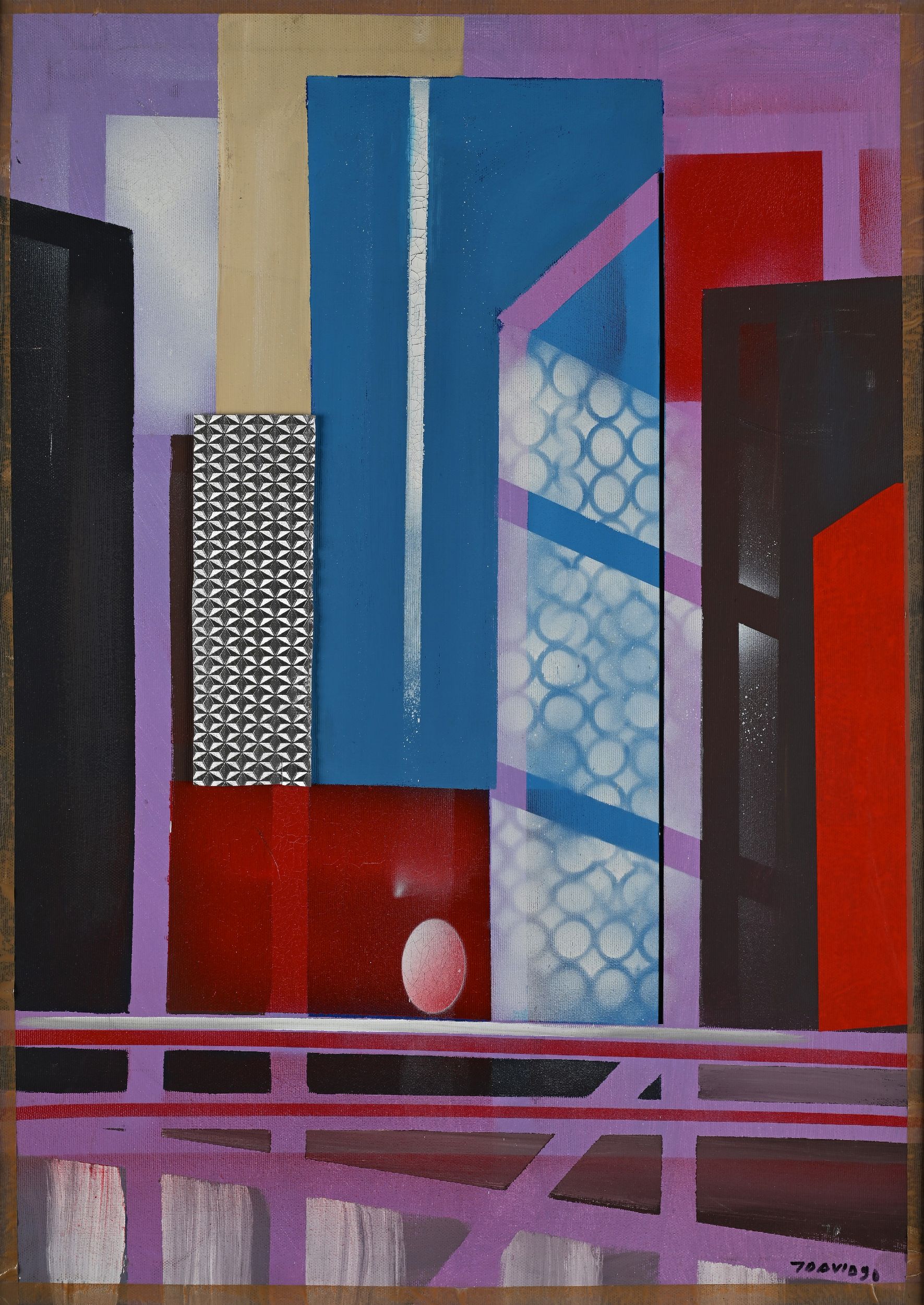 Acrilici, smalti, spray e collage di scotch e poliestere argentato su tela, cm 70x50