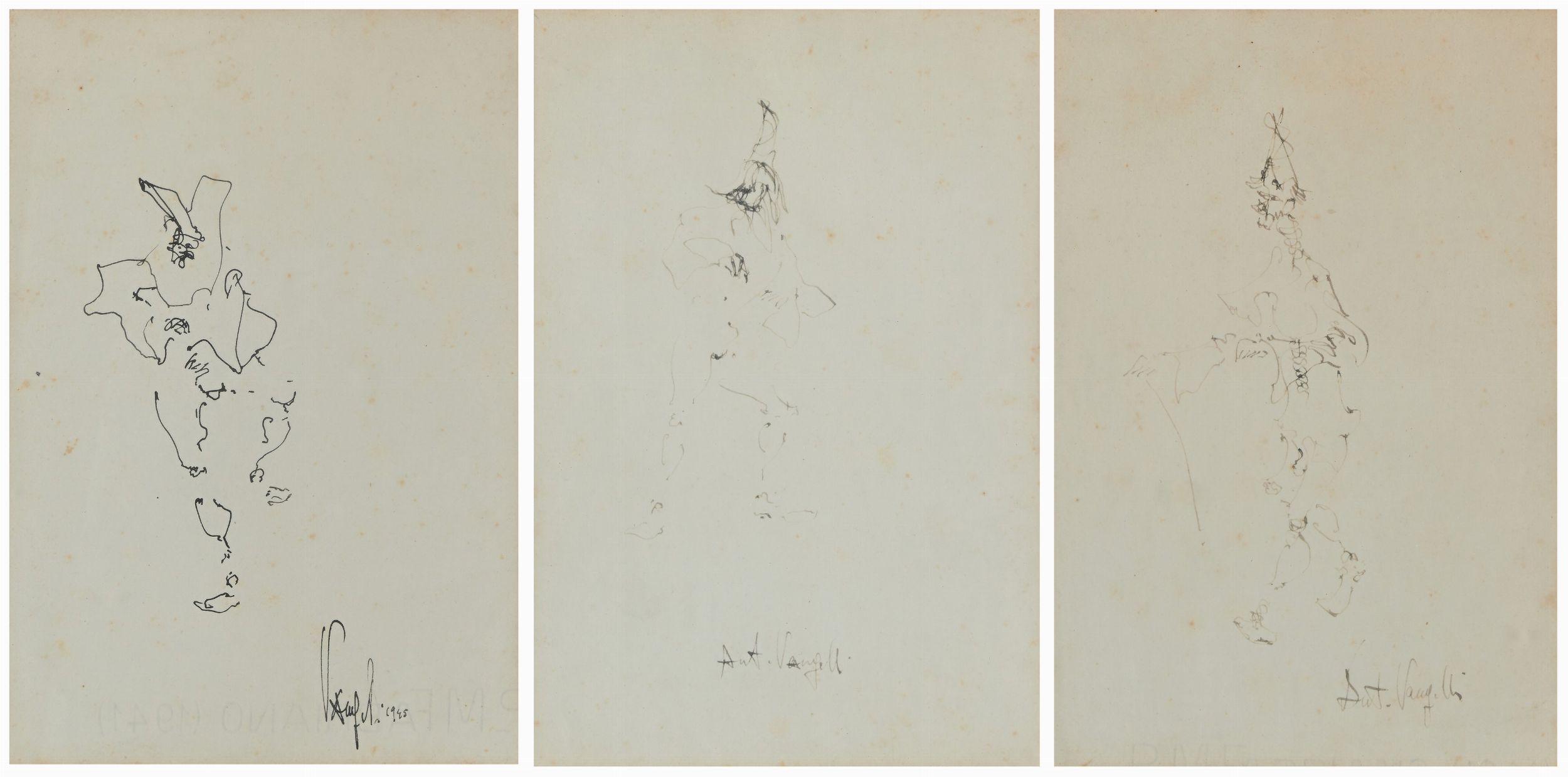 1945 Ogni disegno misura cm 22x15 circa, in cornice cm 34x27. Tutti e tre sono firmati 'Ant. Vangelli'