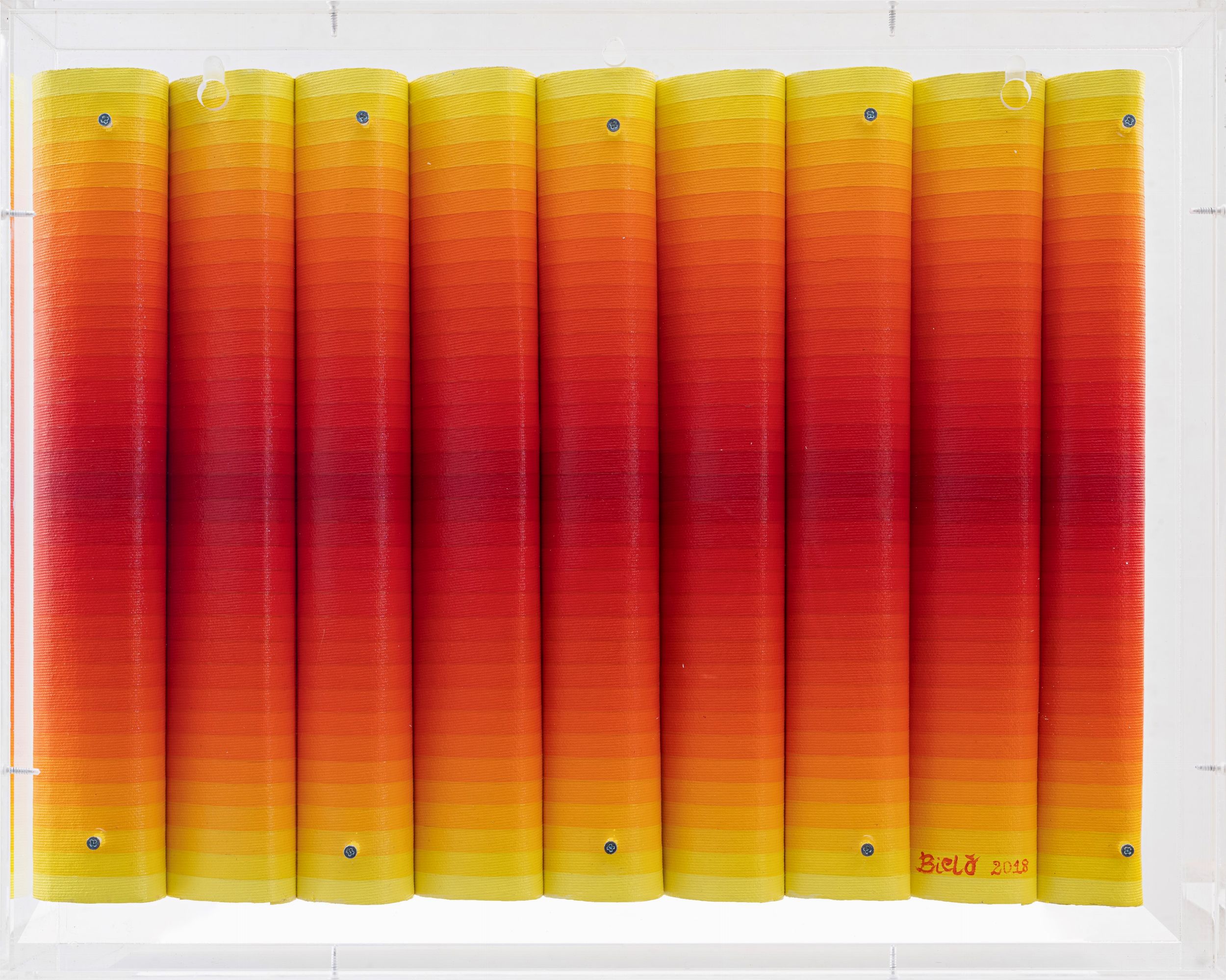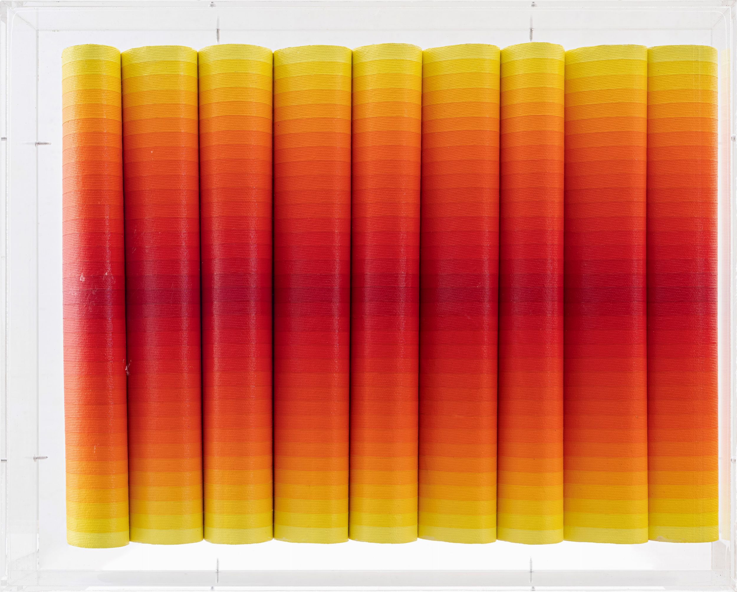 arrotolamento optical della tela entro teca in plexiglass, cm. 40x50x7,5