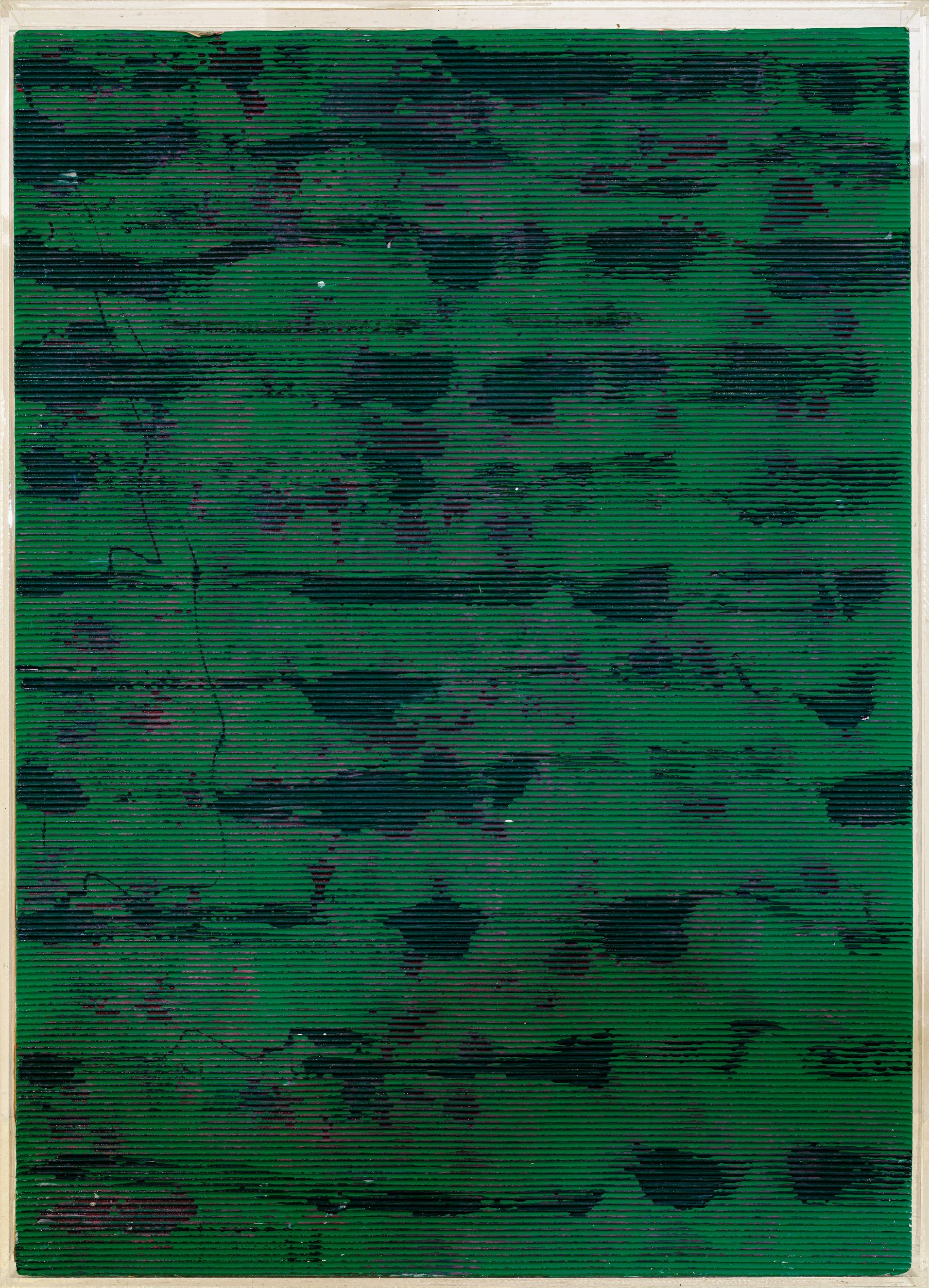 tecnica mista su cartone ondulato entro teca di plexiglass, cm. 70x50x3,5