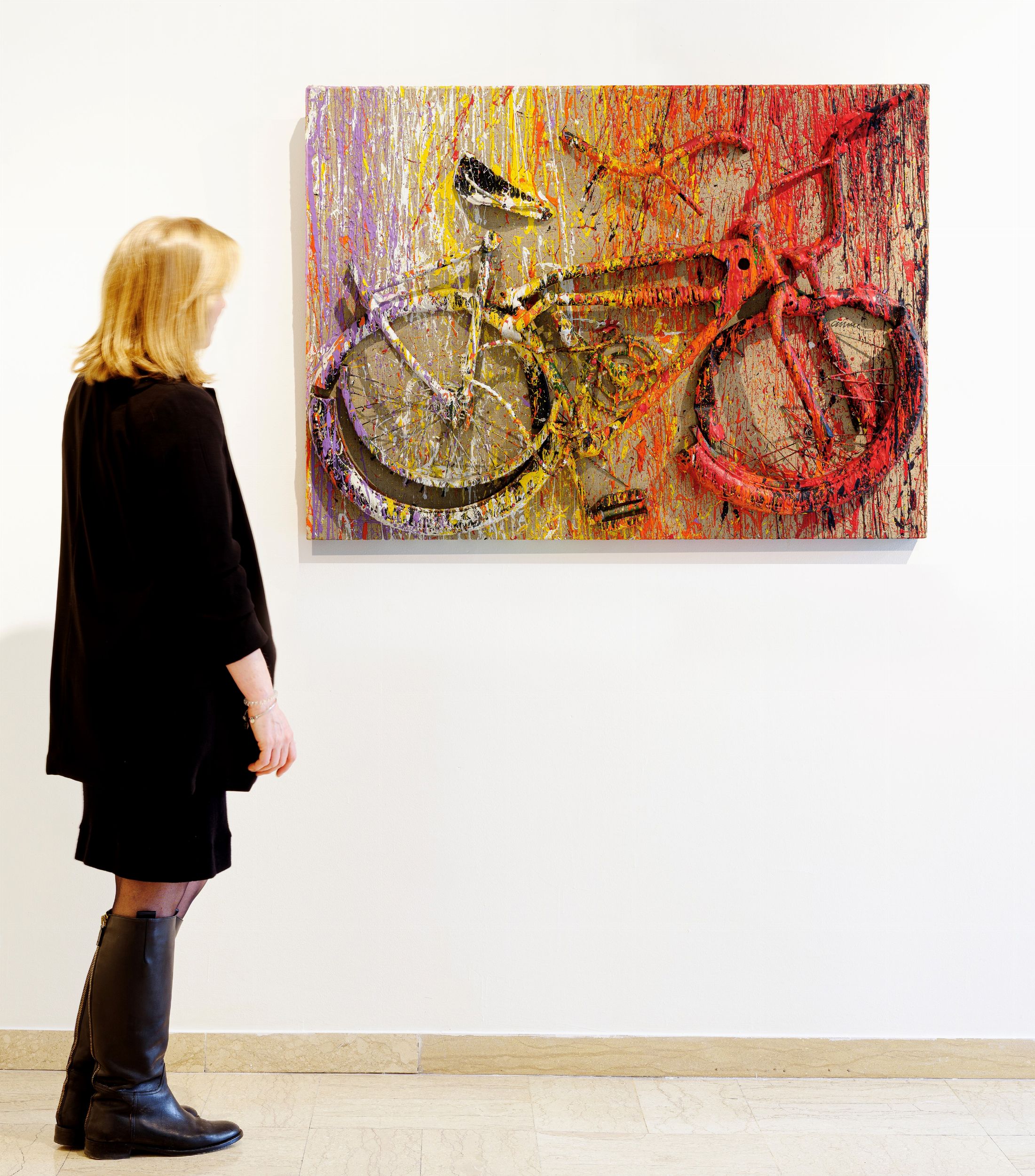 bicicletta tagliata e acrilici su tela riportata su tavola, cm. 90,5x120x22