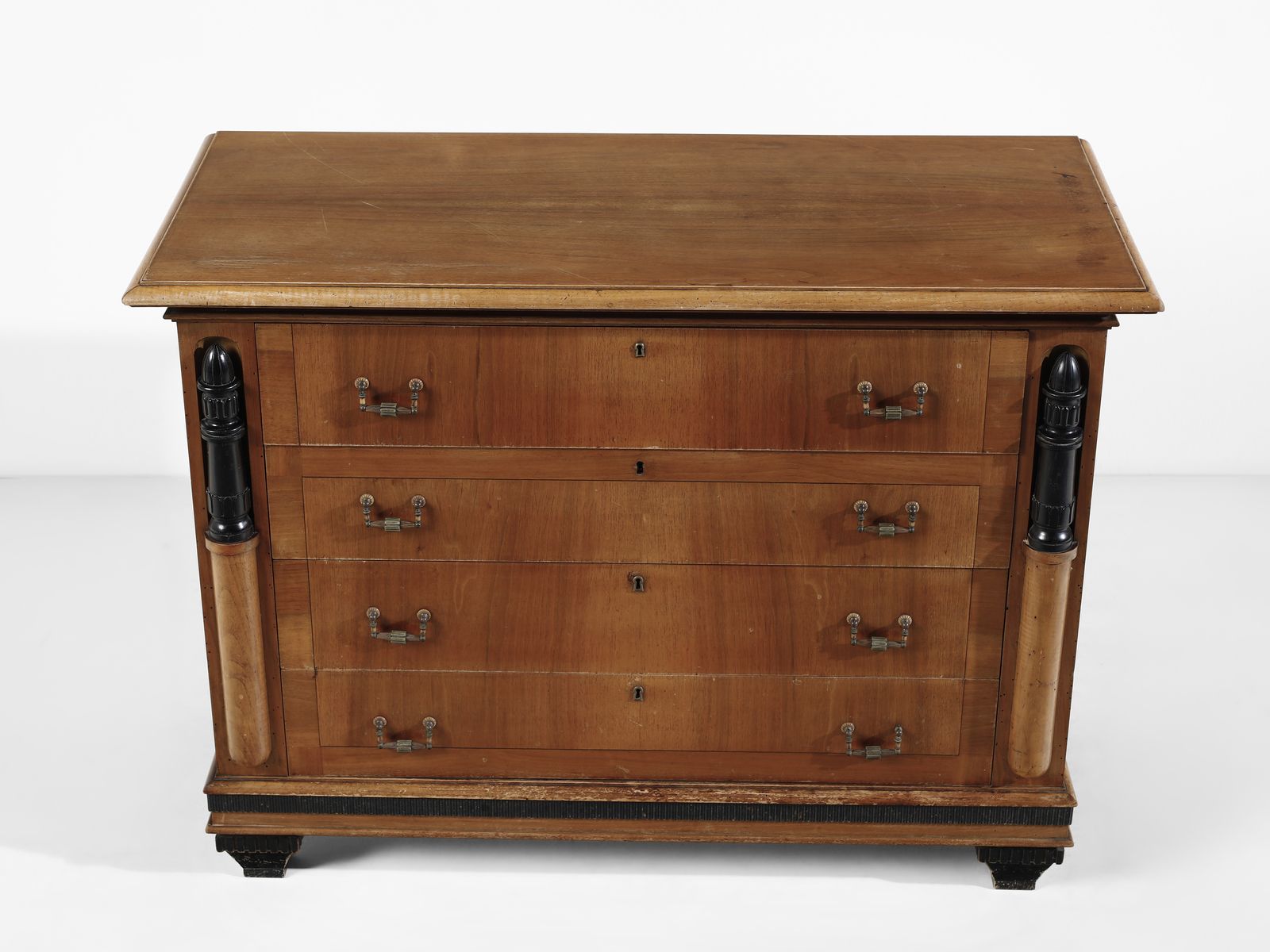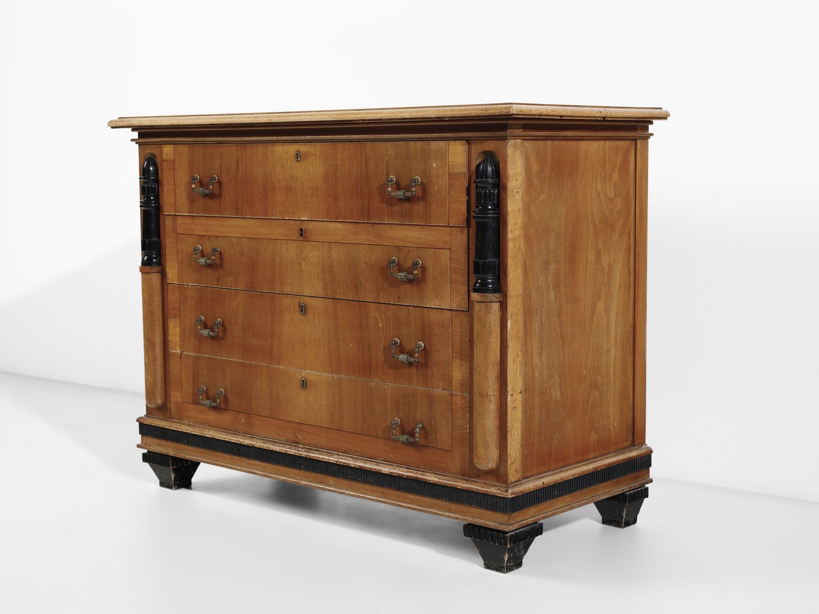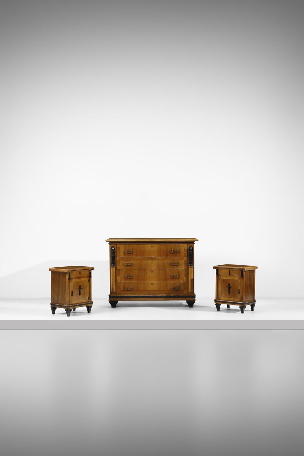 attribuito. Comò a quattro cassetti e coppia di comodini