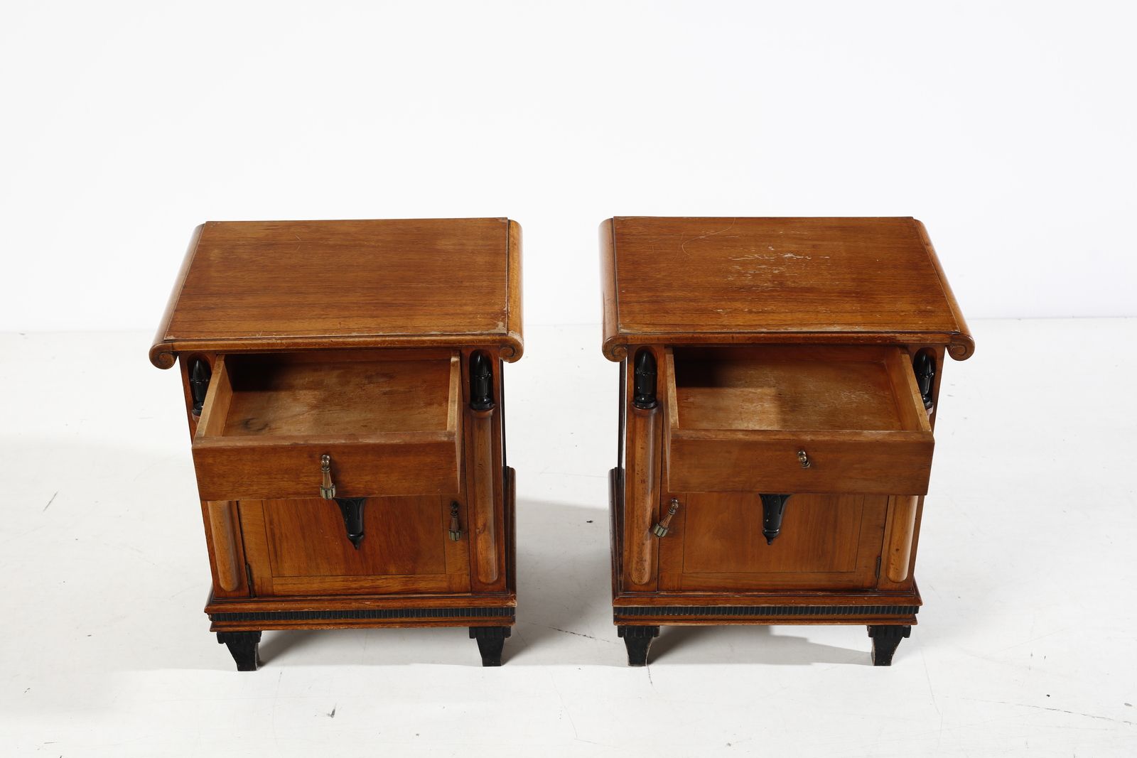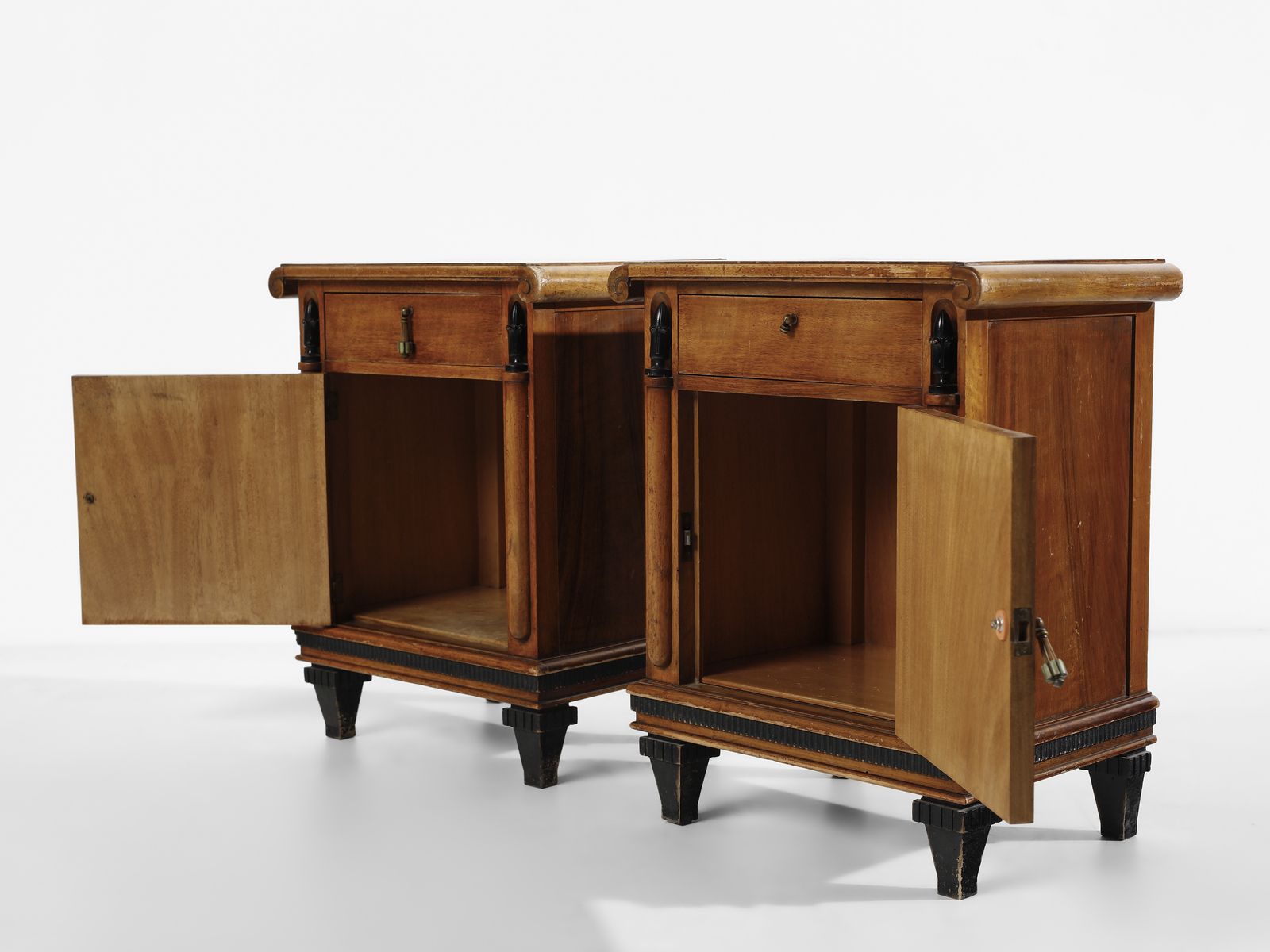Fine anni Dieci / inizi anni Venti.Dimensioni: comò 95 x 127 x 57 cm. comodini 60,5 x 48,5 x 34 cm