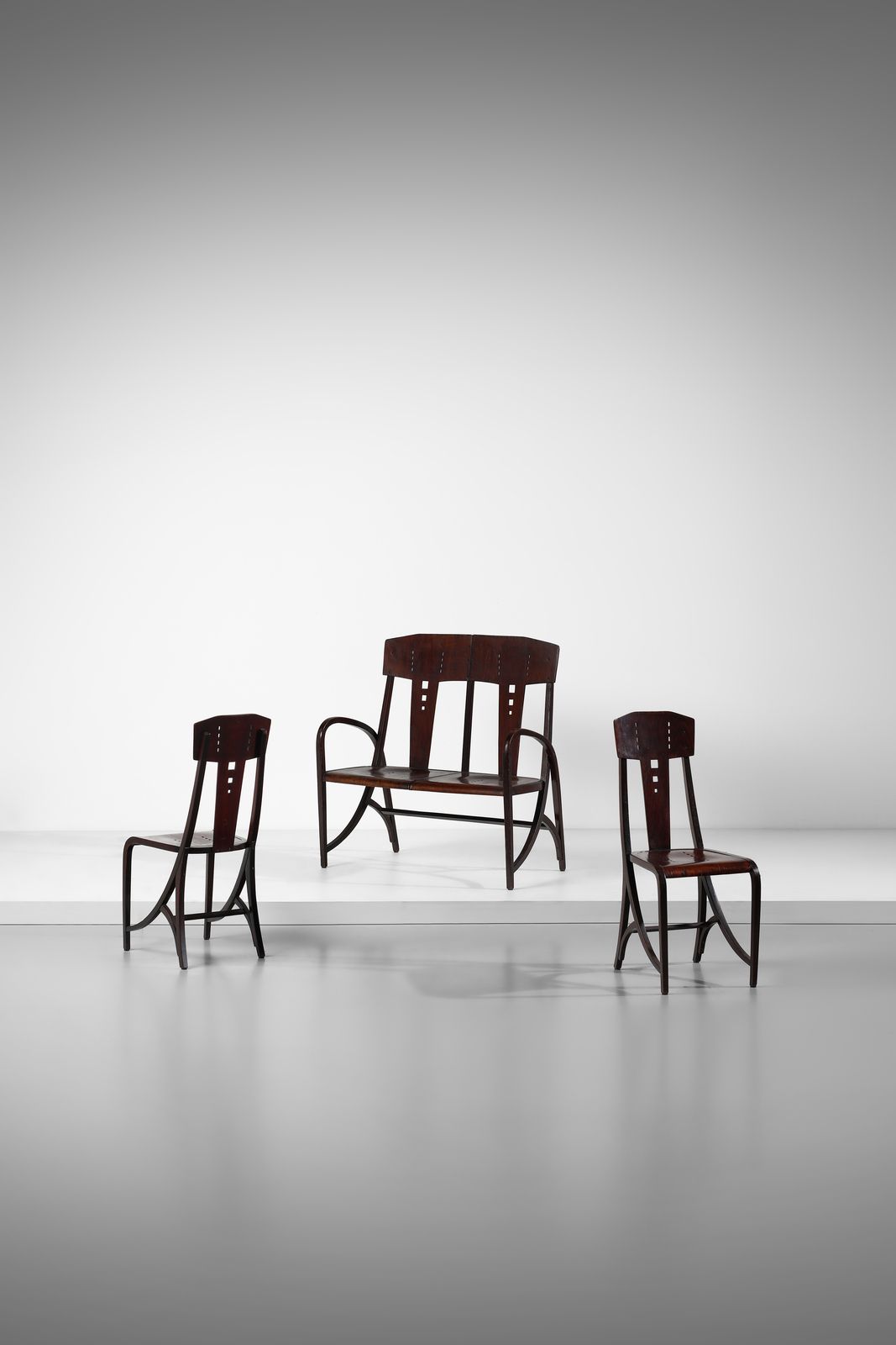 Etichetta cartacea e marchio della manifattura sotto le sedute.Dimensioni: sedie 100 x 42 x 53 cm. divanetto 112 x 108 x 58 cm