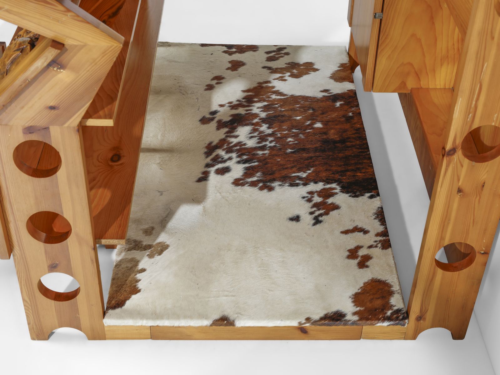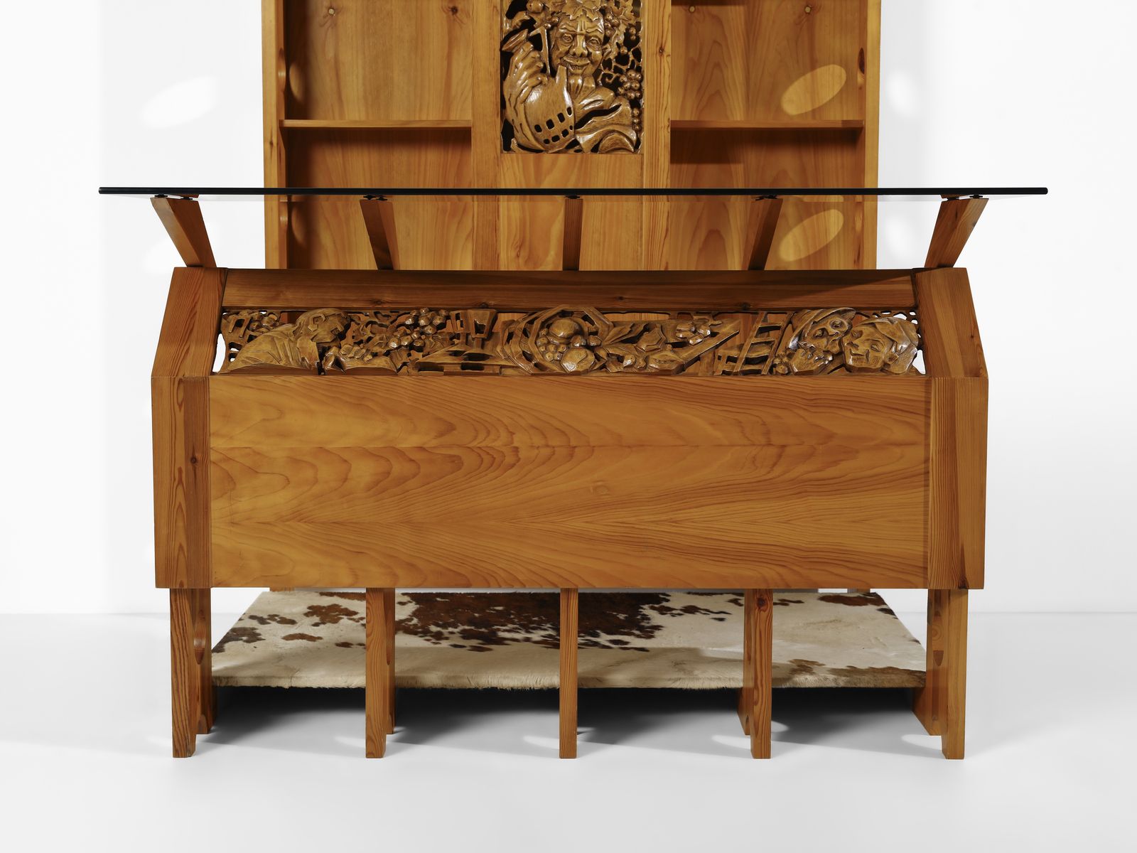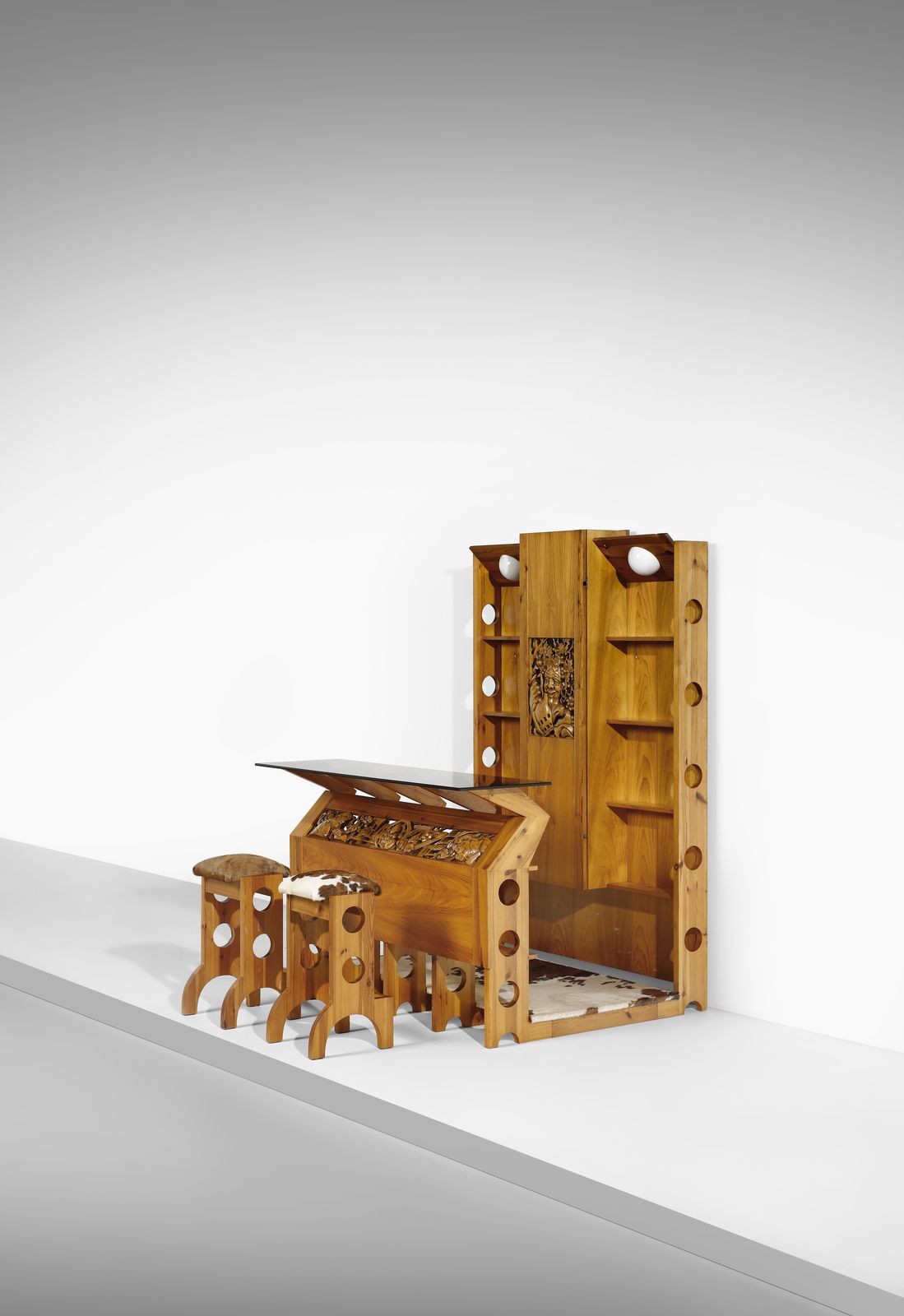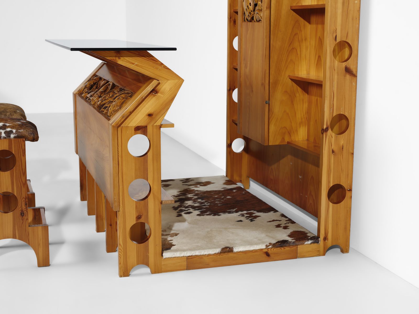 Anni Sessanta.Dimensioni: mobile bar 209 x 160 x 137 cm. sgabelli 69 x 36,5 x 37 cm