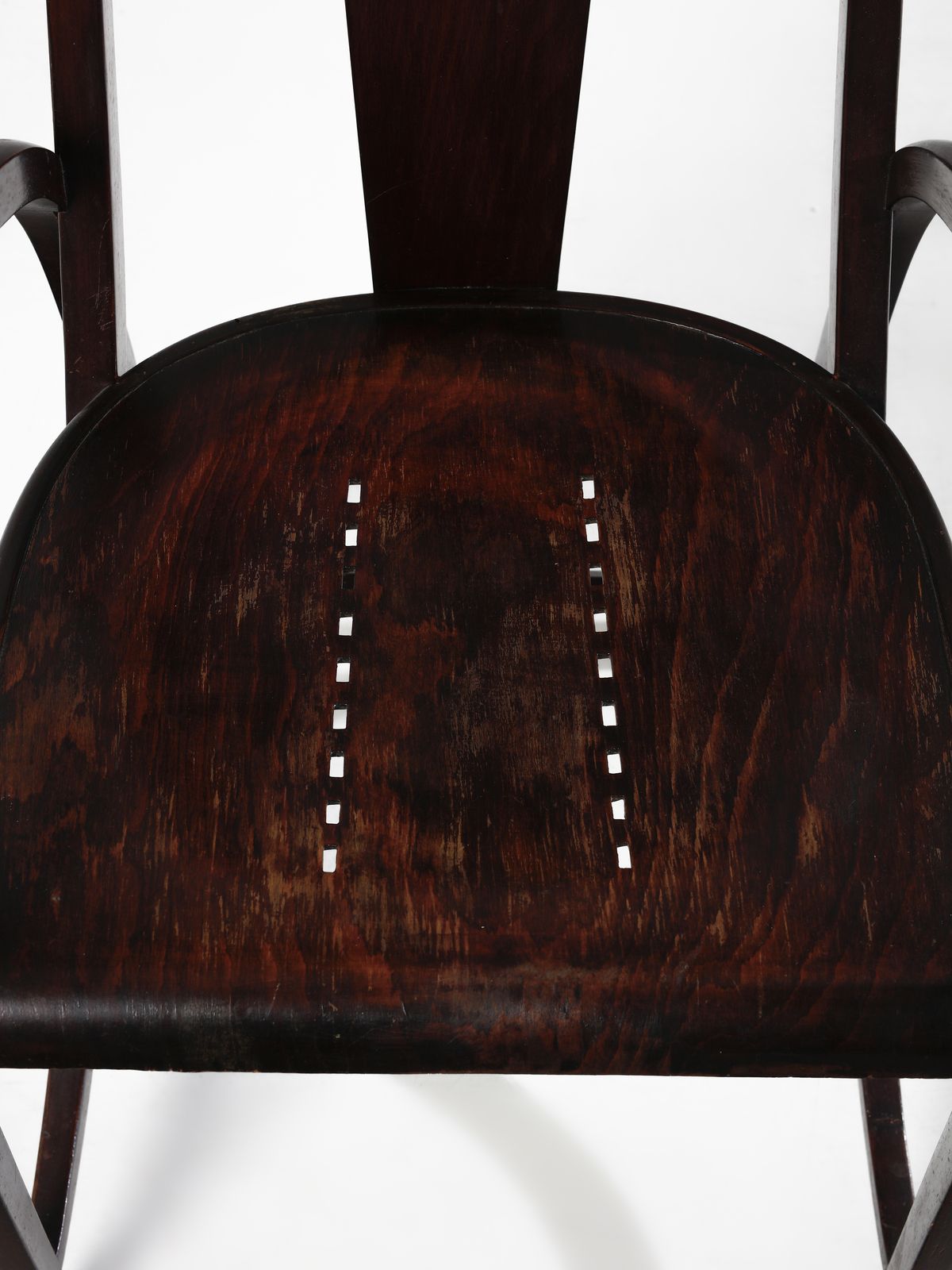 Lacerto di etichetta cartacea e marchio della manifattura sotto la seduta.