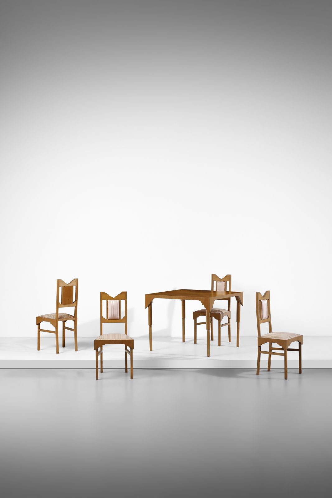 1987/1988.Dimensioni: tavolo 77 x 100 x 100 cm. sedie 100 x 46 x 44 cmBibliografia: Catalogo F.lli Lanza