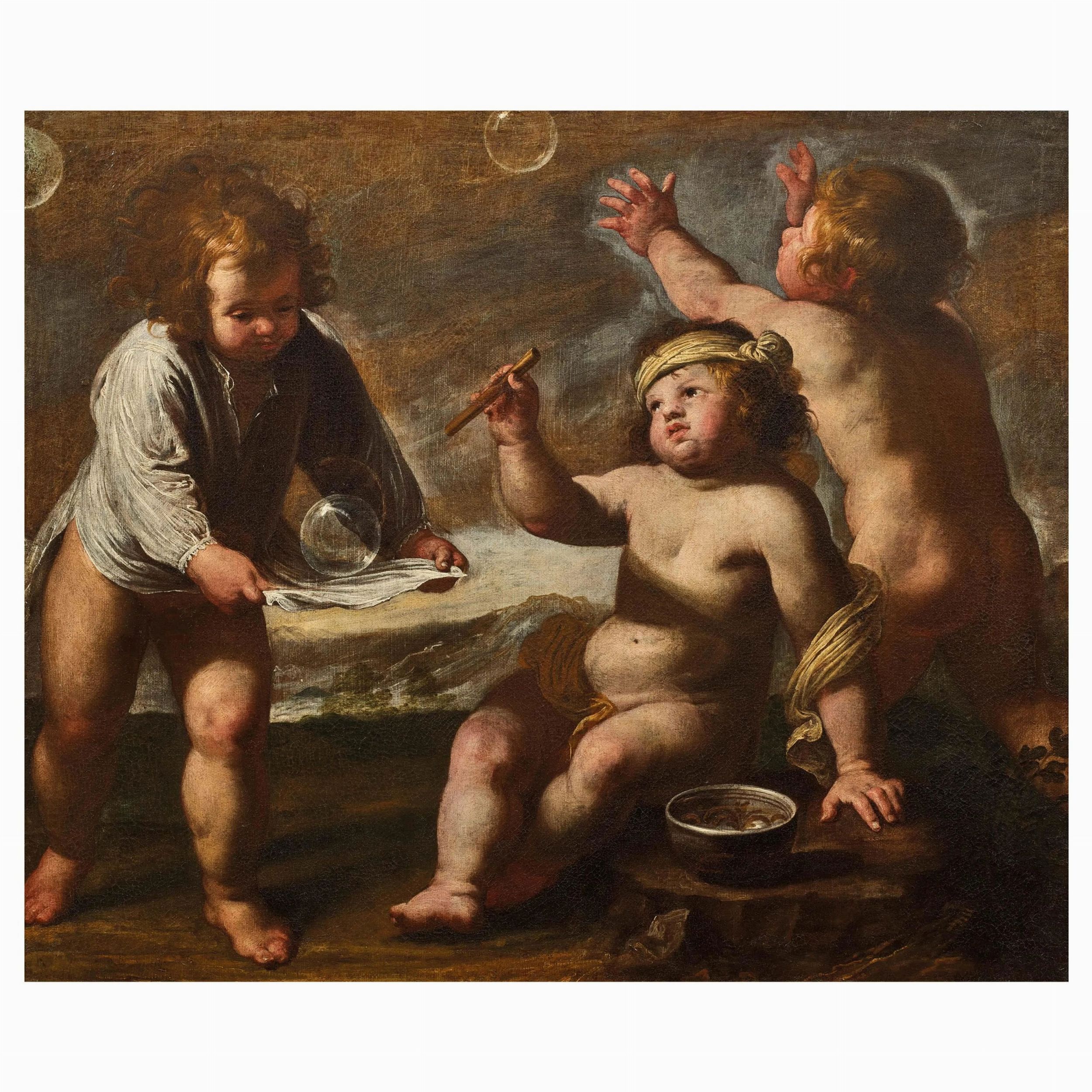 La tela presenta una raffigurazione piuttosto rara. Si tratta di tre putti che giocano con le bolle di sapone. Una tale iconografia è riconosciuta come un’allegoria della vanità, in quanto la bolla era simbolo dell'effimero ed era allusiva della vacuità della vita. Una suddetta interpretazione si evince nel dittico latino di Marco Terenzio Varrone: “quod, ut dicitur, si est home bulle, eo magis senex” (De Rustica, 1,1-7). Il poeta accosta l’uomo ad una bolla di sapone, come avvenne anche, in senso moralistico, in epoca rinascimentale con Erasmo da Rotterdam e poi, successivamente, nell’ambiente romano che ruotava intorno a Cassiano del Pozzo nella prima metà del Seicento. Ed è proprio in questo momento che fioriscono immagini di putti intenti a soffiare per creare bolle di sapone, ma il caso qui presentato è davvero unico. L’opera è stata pubblicata da Anna Orlando come Giovanni Battista Carlone (1603-1683/1684), uno dei pittori più importanti tra quelli attivi a Genova nel Seicento. Per la studiosa si tratta di un’opera da datarsi intorno al 1640 circa, ovvero subito a ridosso del suo soggiorno milanese avvenuto nei primi anni Trenta, in stretto rapporto con il Sacrificio di Isacco già Koelliker e un San Gerolamo di collezione privata. Infatti, nella tela qui presentata “il naturalismo domina sulla componente barocca che prenderà l’avvento qualche anno dopo, con il recupero, soprattutto, del chiassoso colorismo di matrice rubensiana” (Orlando 2019, p. 252).