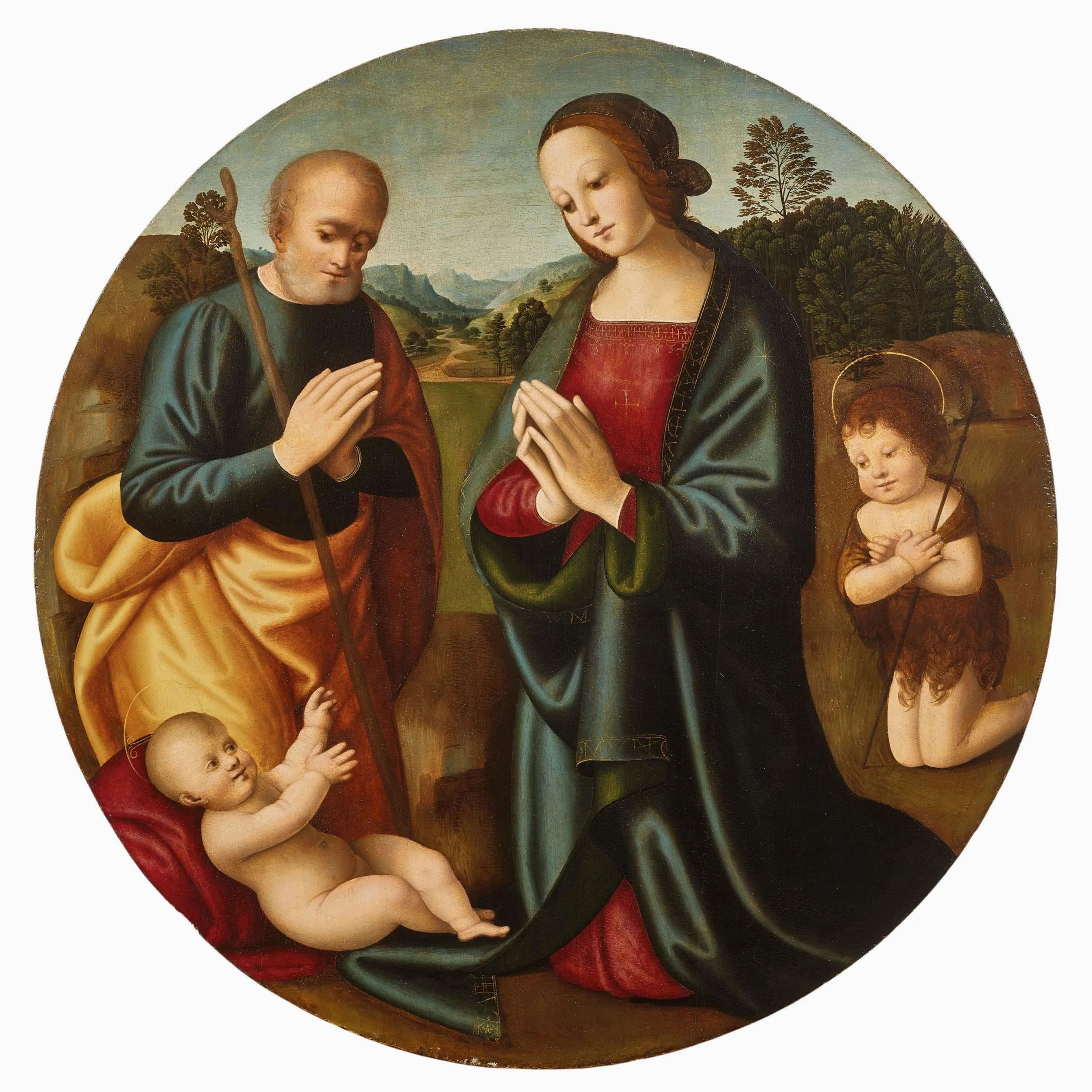 L’inedito dipinto qui descritto presenta la Vergine e san Giuseppe in adorazione del Bambino insieme a san Giovannino. Alle loro spalle si dipana un paesaggio scandito dal dolce zigzagare di un sentiero che conduce ad una città ai piedi delle montagne. L’opera è riconducibile al Maestro del Tondo Campana, un anonimo pittore fiorentino attivo all’inizio del XVI secolo, specializzato nell’esecuzioni di tondi con la Sacra famiglia destinati ad una committenza privata. La Sacra famiglia con san Giovannino in adorazione del Bambino conservata al Musée du Petit Palais di Avignone (inv. 20216) è il namepiece del pittore in quanto proveniente dalla prestigiosa collezione di Giampietro Campana (Roma, 1808/1809 – 1880), noto per aver messo insieme una straordinaria raccolta di primitivi italiani, in seguito acquisiti dallo Stato francese e nel 1976 depositati al Museo di Avignone. Al pittore sono oggi attribuibili una dozzina di dipinti di cui il nucleo principale venne identificato da Filippo Todini nel 1989 e a cui poi si aggiunsero nuove scoperte negli anni successivi. Tra queste, il tondo venduto recentemente all’asta da Sotheby’s a New York ( Master Paintings , 22 maggio 2019) attribuito al Maestro da Emanuele Zappasodi, che propone la medesima composizione di quello qui presentato.