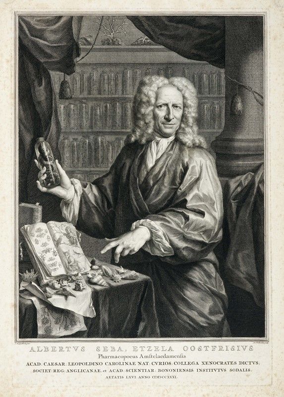 Bulino. mm 440x302. Foglio mm. 478x341. Le Blanc, 183. Ritratto del celebre zoologo e farmacista olandese utilizzato come antiporta della sua estesa opera Locupletissimi Rerum Naturalium Thesauri accurata Descriptio, Amstelaedami: apud Janssonio-Waesbergios, & Westenium, & Gul. Smith [poi] Arksteum et Merkum, Petrum Schouten, 1734-1765. Ottima impressione su carta vergellata spessa.