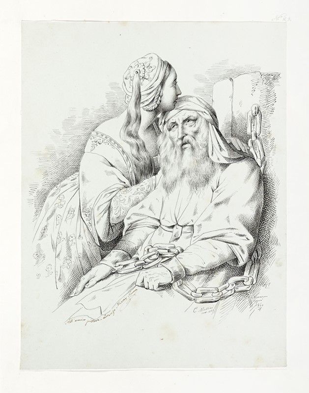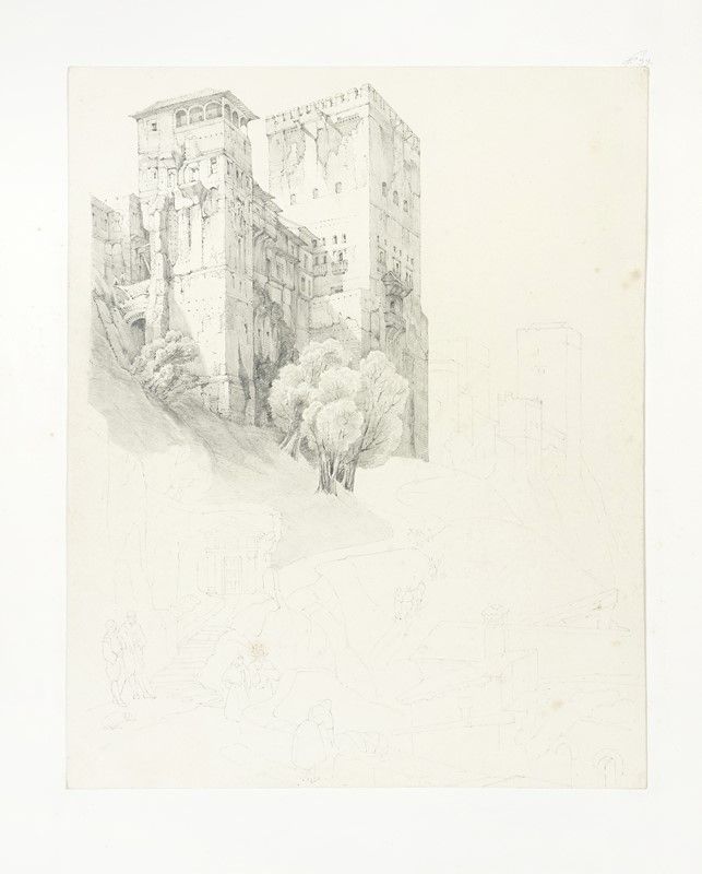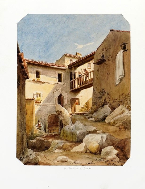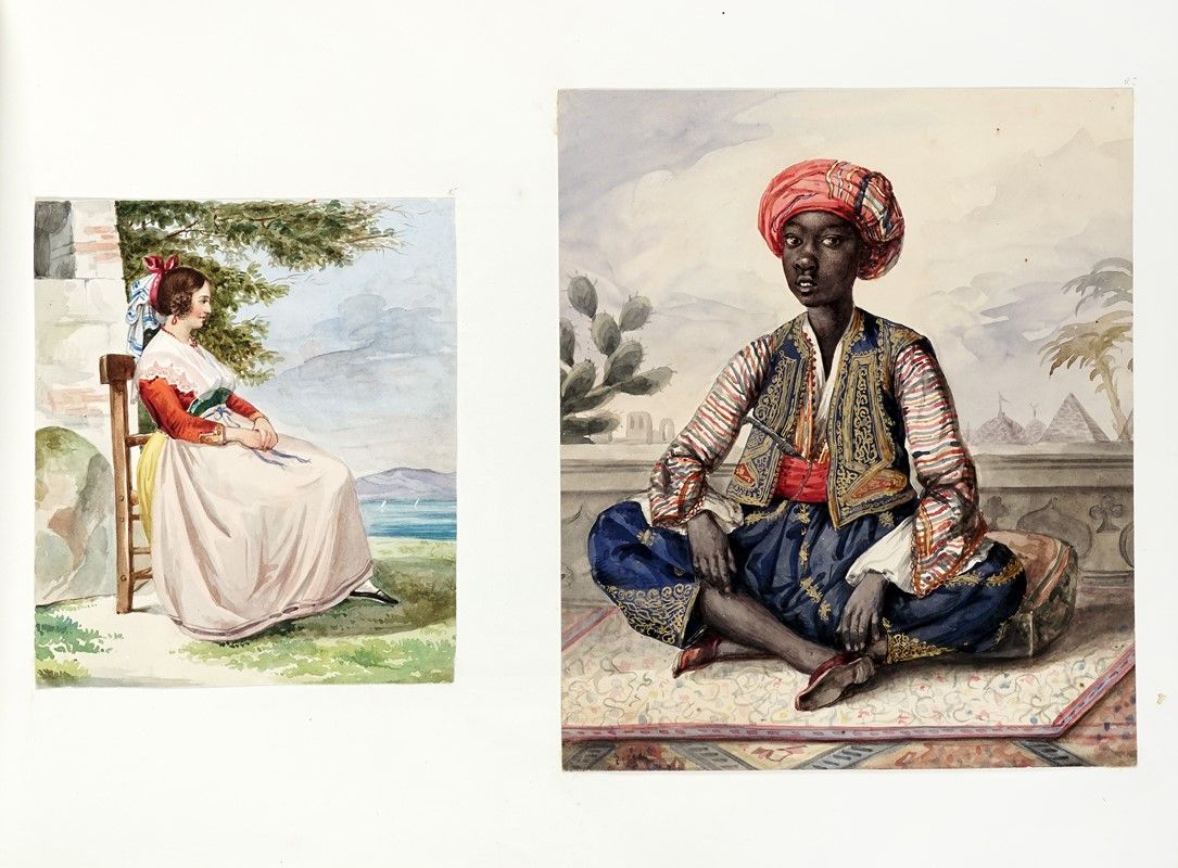 In folio oblungo (mm 425x595). Legatura in mezza pelle marrone con dorso decorato ad arabeschi e iniziali "S.V." in oro, piatti in tela verde. Alcuni segni d'usura. Grande album contenente 67 tra disegni e acquerelli, di vario formato ed eseguiti con tecniche diverse (matita di grafite e matita nera, penna e inchiostro bruno, rialzi a biacca, pennello e acquerello). Sono presenti alcuni fogli del XVIII secolo o copie dall'antico e originali del XIX secolo, vedute di città (Grande scorcio di Firenze con i suoi monumenti, dintorni di Roma con le sue rovine) e paesaggi. Tra i disegni antichi si richiama l'attenzione su un bellissimo studio per Falaride getta Perillo nel toro di bronzo. Si segnalano riferimenti a Giuliano Traballesi (Firenze, 1727 – Milano, 1812), Gaetano Piattoli (Firenze, 1703 -Roma, 1774), Giuseppe Bezzuoli (Firenze, 1784-1855), Cesare Mussini (Berlino, 1804 – Firenze, 1879), Raffaele Morghen (Portici, 1758 – Firenze, 1833).
