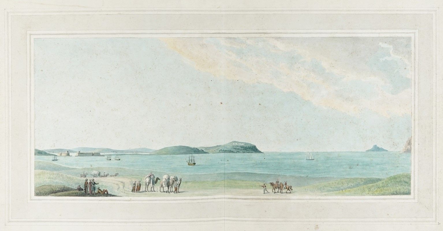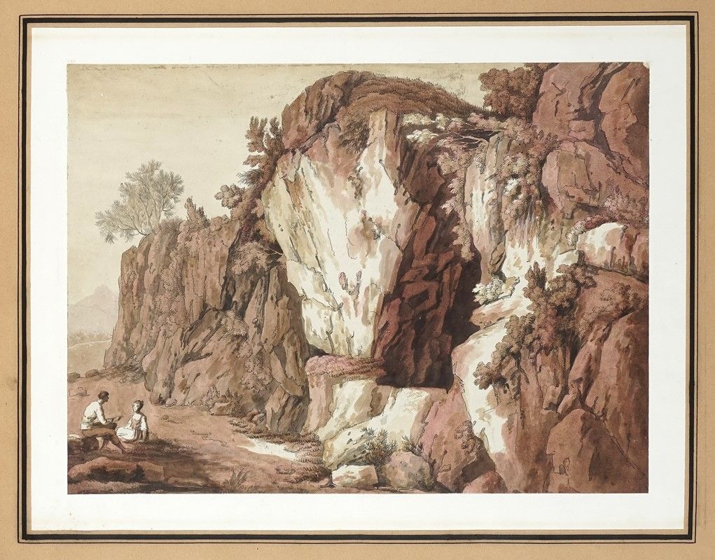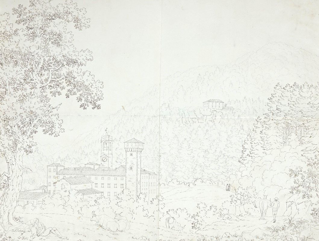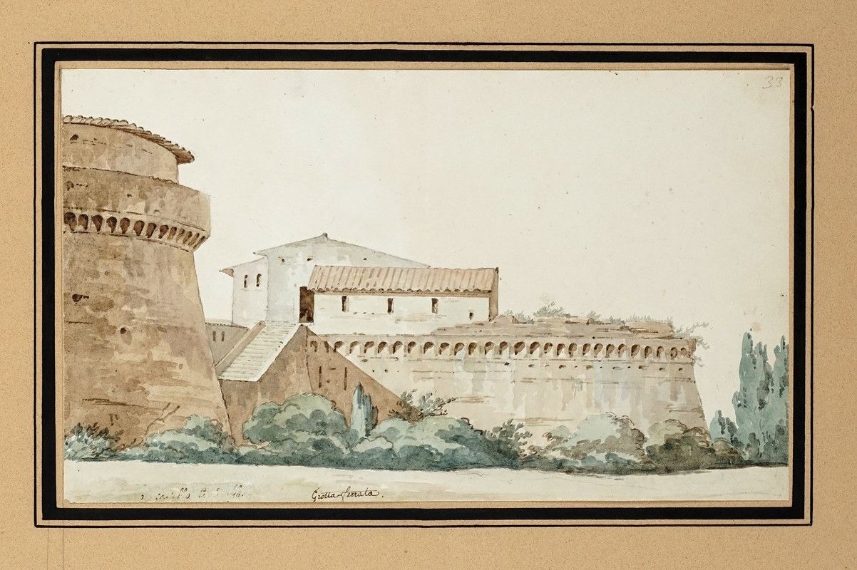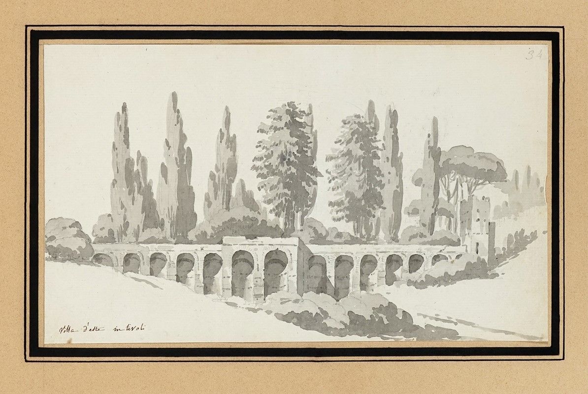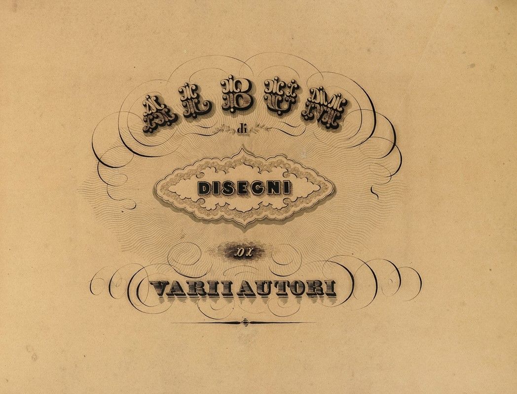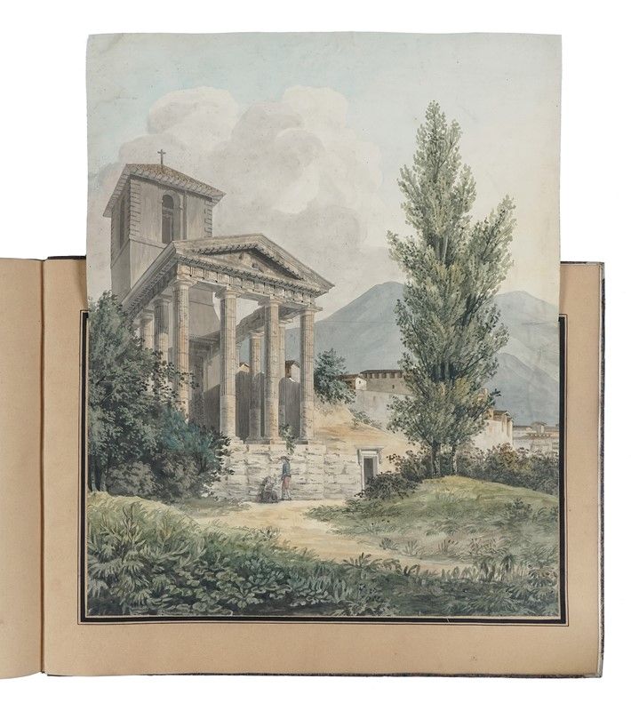 In folio oblungo (mm 449x600). Legatura in mezza pelle marrone piatti in carta decorata con all'anteriore inserto in pelle con titolo in oro. Al contropiatto anteriore etichetta di appartenenza del pittore ornatista Cesare Maffei (Siena, 1805 - post 1876). Raccolta di disegni e acquerelli formata da esercitazioni accademiche di traduzione, ma per la maggior parte da vedute tratte dal vero o fantastiche, con begli scorci di Napoli, una veduta di Grottaferrara, altra di Villa d'Este a Tivoli, stupenda grande veduta di Vallombrosa siglata e con la data "1802", bella marina orientalista.