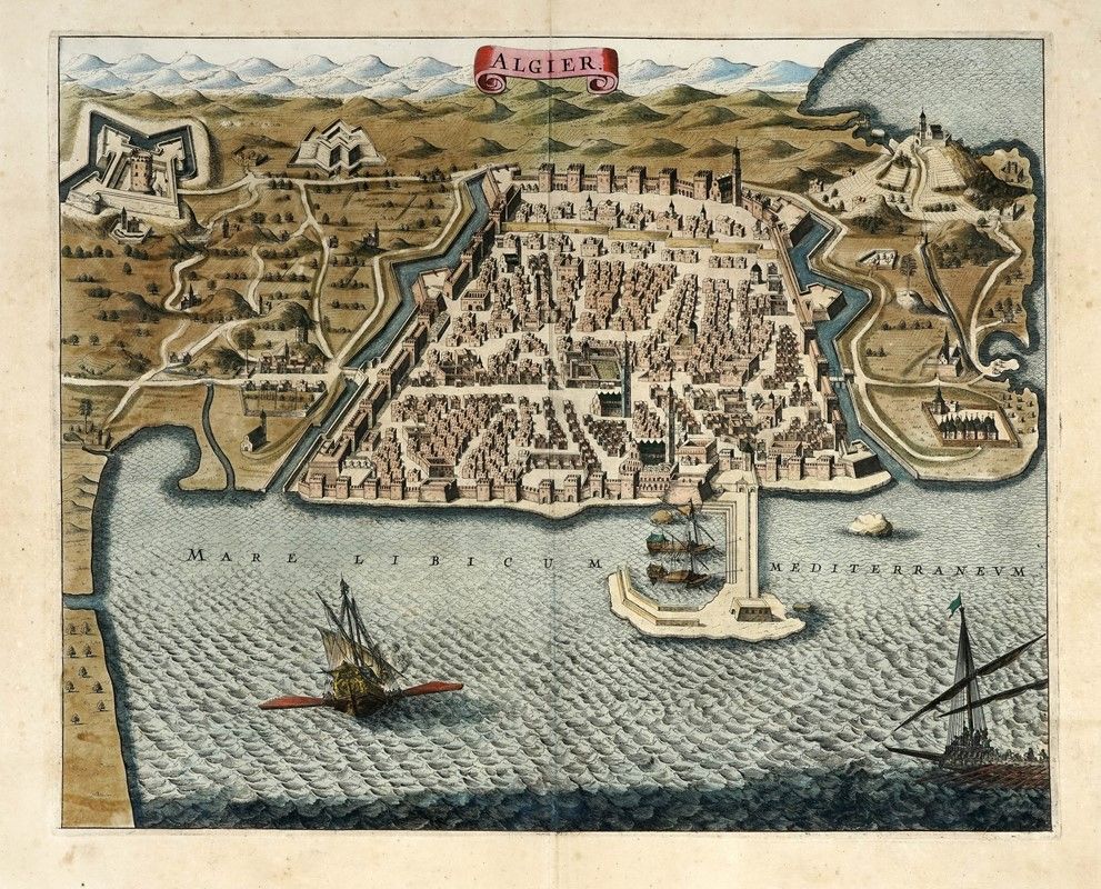 Incisione in rame in coloritura. mm 412x517. Foglio: mm 478x587. Da Theatrum in quo visuntur illustriones Hispaniae Urbes aliaeque ad Orientum & austrum Civitates celebriores..Illustriorum Hispaniae Urbium tabulae. VIII. Amsterdam: [1657]. Bella veduta di Algeri con il porto e le fortificazioni dall'ottavo volume deil'opera di Jansson, dedicato alle città della Spagna e a quelle nel Nord Africa (Il Cairo, Algeri, Tunisi), in Medio Oriente (Costantinopoli, Damasco, Aden, Isfahan), del Sud Est Asiatico (Batavia, Goa, Quintzai, Calcutta) e Cuzco in Sud America. Le vedute combinano sia nuove tavole di Jansson sia quelle adattate dal Civatates Orbis Terrarum.