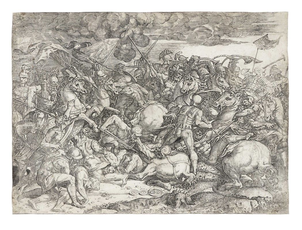Acquaforte. mm 403x550. Bartsch, XVI, 37. Massari (raphael invenit), p.113,II,2. Il combattimento raffigura la sola parte sinistra della Battaglia di Ponte Milvio affrescata nella Sala di Costantino dei Palazzi Vaticani. L'acquaforte non è comunque tratta dall'affresco ma dal cartone di Giulio Romano all'Ecole des Beaux Arts di Parigi (inv.2773). Variamente attribuita anche a Orazio Farinati, la critica più recente sembra tuttavia assegnare l'incisione, per la condotta sicura e il sapiente uso del chiaroscuro, a Battista del Moro. Buona prova su carta vergellata pesante con filigrana "fiore di giglio in cerchio singolo sormontato da grande corona".