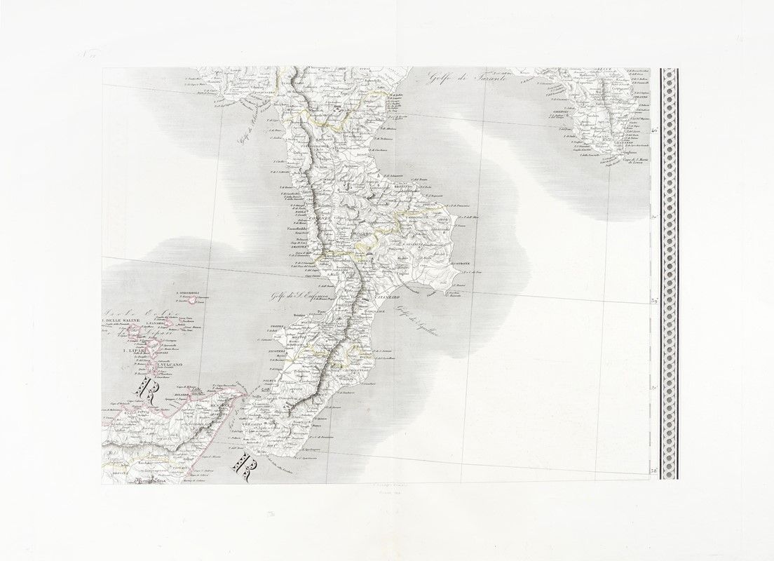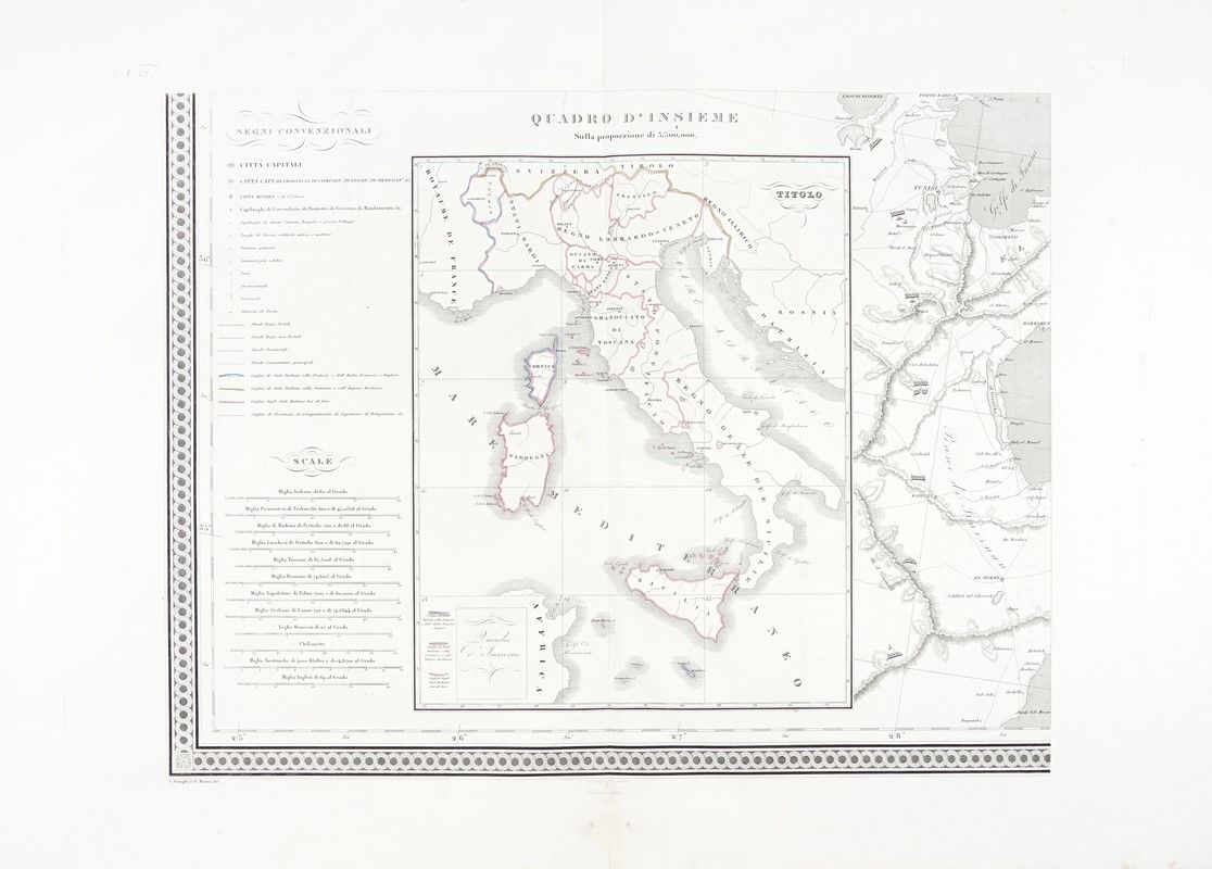 Incisione in rame con confini in coloritura, su 15 lastre ognuna mm 595x740. Foglio: mm 618x860 ciascuno. Monumentale mappa in 15 fogli sciolti a doppia pagina facente parte del Volume I dell' Atlante geografico degli stati italiani delineato sopra le migliori e più moderne mappe per servire di corredo alla Corografia fisica storica e statistica dell'Italia. Firenze: [S.E.], 1844.