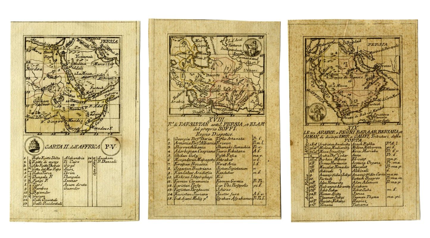 Incisione in rame in coloritura originale coeva. mm 115x72. Mappa comprendente la penisola arabica, con indicate Medina e La Mecca, e la parte orientale dell'Africa con l'Egitto, in evidenza il corso del Nilo, Etiopia, Eritrea e Somalia. / Farsistan. Incisione in rame in coloritura originale coeva. mm 113x74. Mappa dei territori sul Golfo Persico e attorno al Mar Caspio: antica Persia, Azerbaijan, Armenia, Turkmenistan. / Le tre Arabie. Incisione in rame in coloritura originale coeva. mm 115x73. Mappa delle tre regioni che per i Romani facevano parte della penisola arabica; Arabia Magna, Arabia Felix e Arabia Petraea.