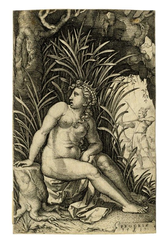 Bulino. mm 115x74. Bartsch, VIII, 73. Hollstein, 122. Con il monogramma e la data "1539" nel cartiglio del titolo sulla lastra in basso a destra. Da una serie in quattro tavole dedicata alle eroine greche. Ottima prova in tiratura precoce, con ancora ben visibile il profilo della montagna sotto il braccio destro di Cefalo, stampata con bel contrasto su carta vergellata sottile. Al verso marchio a inchiostro violetto di Marco Guidelli Guidi (Asti, 1893- Solara, 1983) con indicazione del luogo "Solara", non su Lugt.