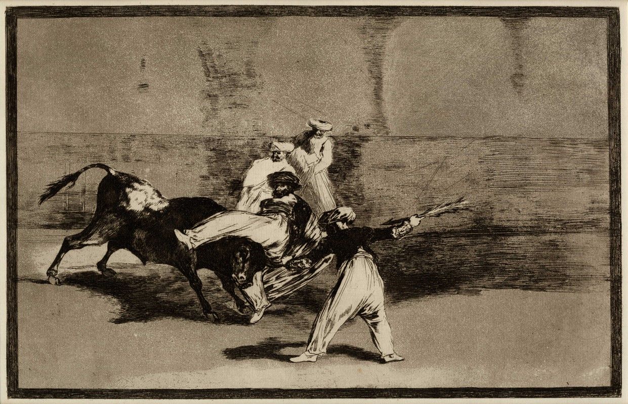 Acquaforte, acquatinta brunita, puntasecca. mm 264x355. Foglio: mm 327x475. Harris, 221. Con il numero "8" in alto a destra. Ottava tavola dalla Tauromachia, serie pubblicata per la prima volta da Goya nel 1816 in trentatre tavole, alle quali dalla III edizione (curata nel 1876 da Loizelet) si aggiungono altre sette tavole contraddistinte da A a G e inizialmente rifiutate dall'autore, portando a quaranta il numero totale delle incisioni nella serie. Bellissima impressione dalla III edizione di 7, pubblicata nel 1876 da Loizelet, su carta vergellata sottile con parte di filigrana "Arches". Al verso in basso marchio della collezione di Charles Deering (Lugt, 516).