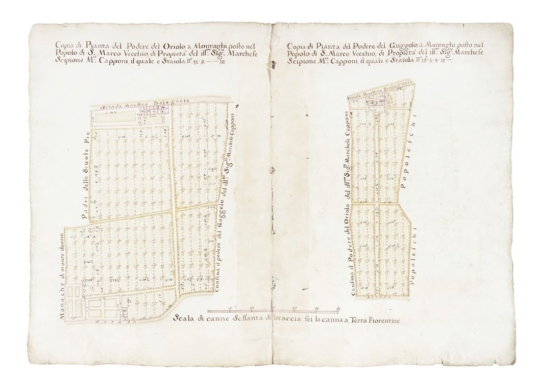 Penna e inchiostro bruno, acquerello seppia su carta vergellata pesante. mm 495x760. Cabrei su due pagine, a sinistra il Podere del Oriolo e a destra il Podere del Guggolo, entrambi con titolo descrittivo in alto su tre righe e misurazione in staiola. In basso al centro "Scala di canne Settanta di braccia sei la canna a Terra fiorentine". In entrambi gli appezzamenti figurano le nuove piantumazioni e le misure, in alto indicata la Strada Maestra Bolognese. Al rilievo del Podere del Oriolo a destra indicati i confinanti: Monache di monte domini e Padri delle Scuole Pie.