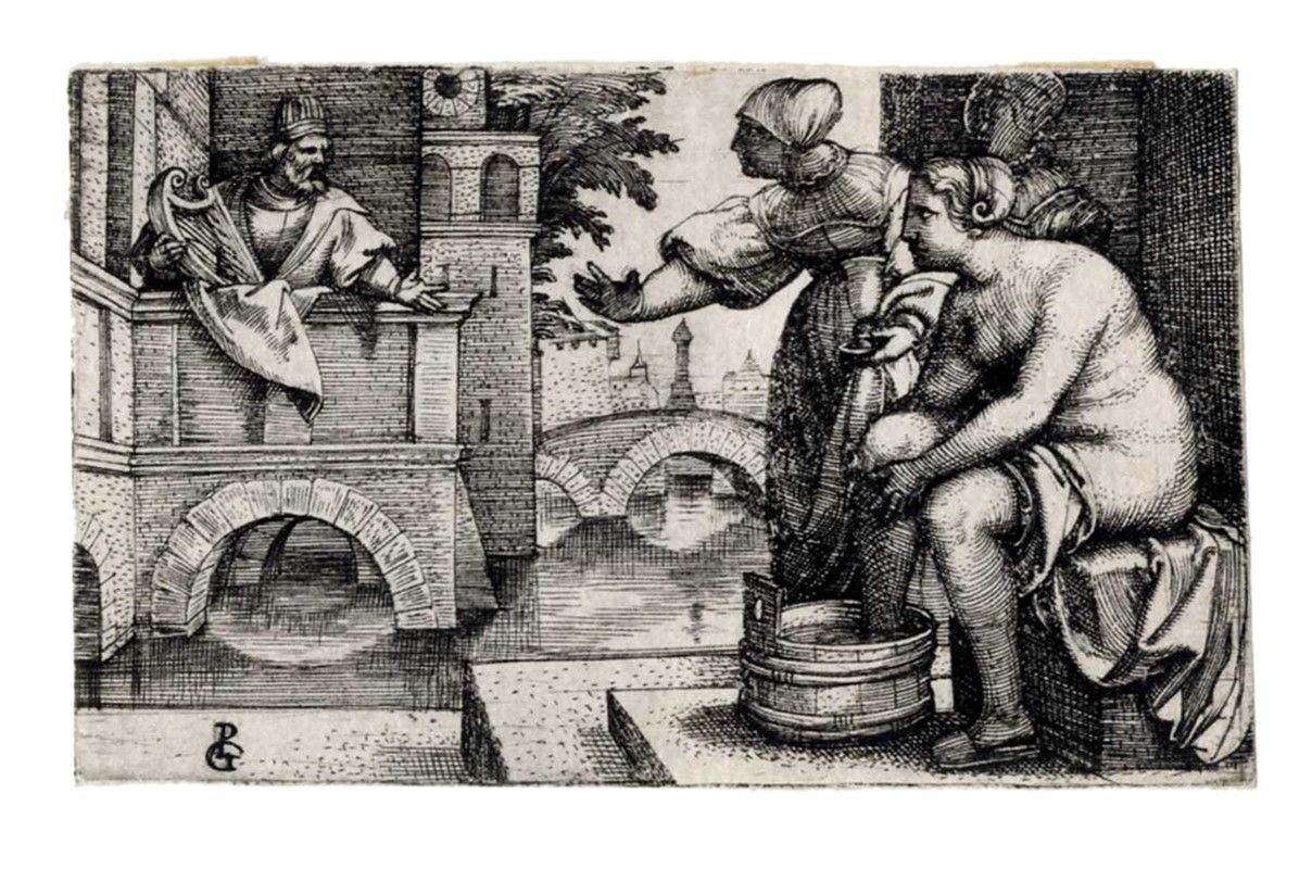 Bulino. mm 47x77. Landau, 20. Hollstein, 14. Con il monogramma sulla lastra in basso a sinistra. Bellissima impressione stampata con grande nitidezza e inchiostrazione brillante su carta vergellata sottile. Al verso in basso marchio della collezione Vittorino Cavalli (Lugt, 4608).